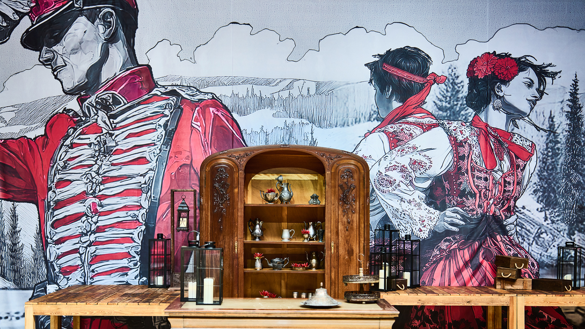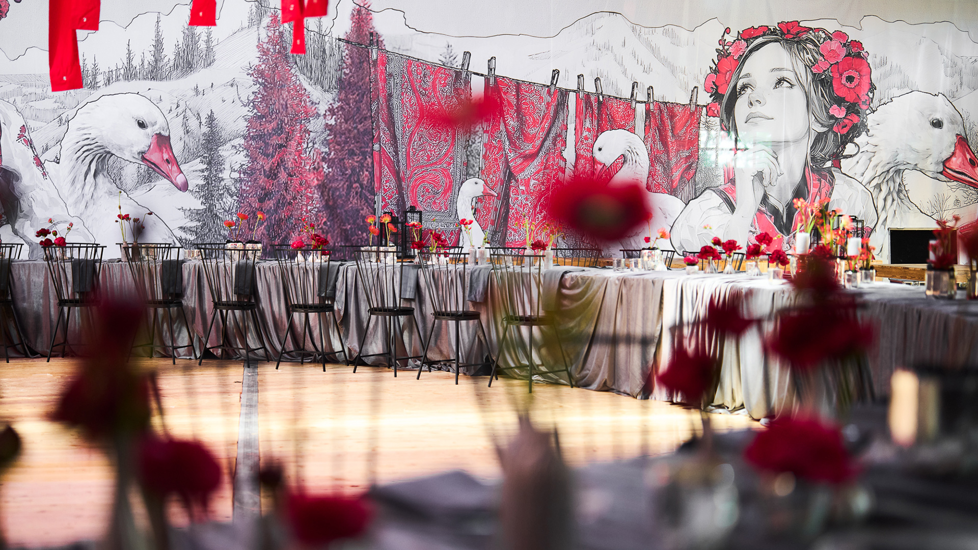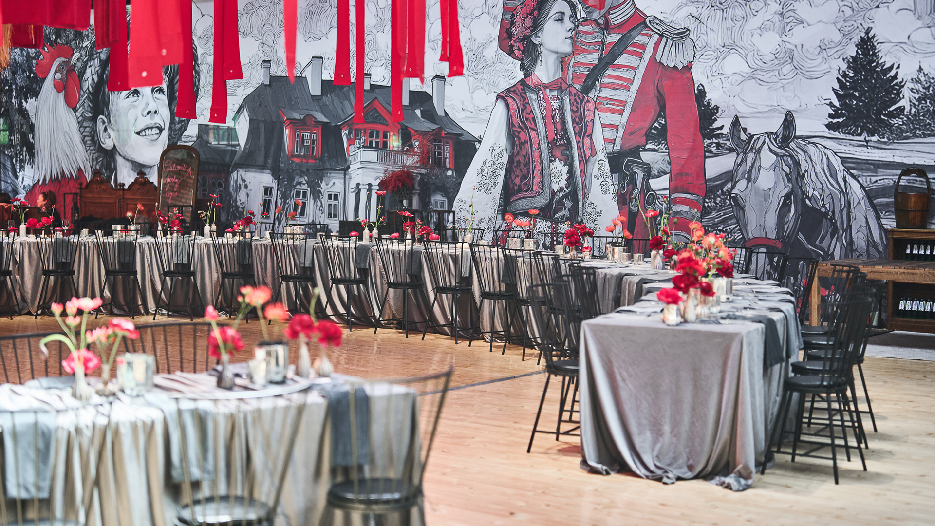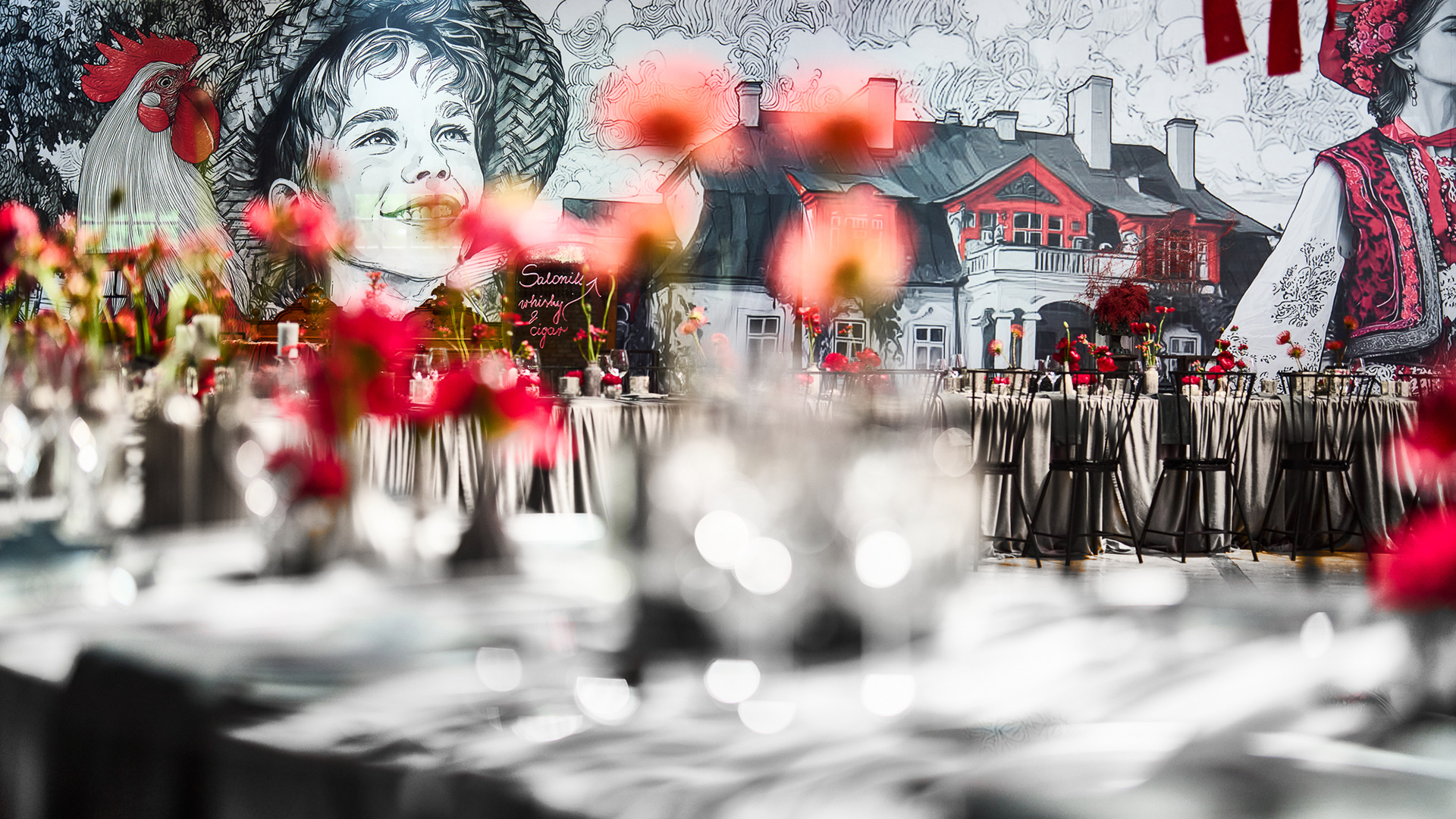 Kultura staropolska i kultura góralska, mężczyzna i kobieta oraz ich wspólne urodziny. Czy to da się pogodzić? Opracowanie graficzne było kluczowe w tym projekcie, gdzie wszystkie ściany otoczyła historia każdego z jubilatów. Wielki, okrągły stół scalił wszystkich gości a podwieszenie podkreślało uroczysty charakter przyjęcia. Grafit i czerwień, spokój i energia