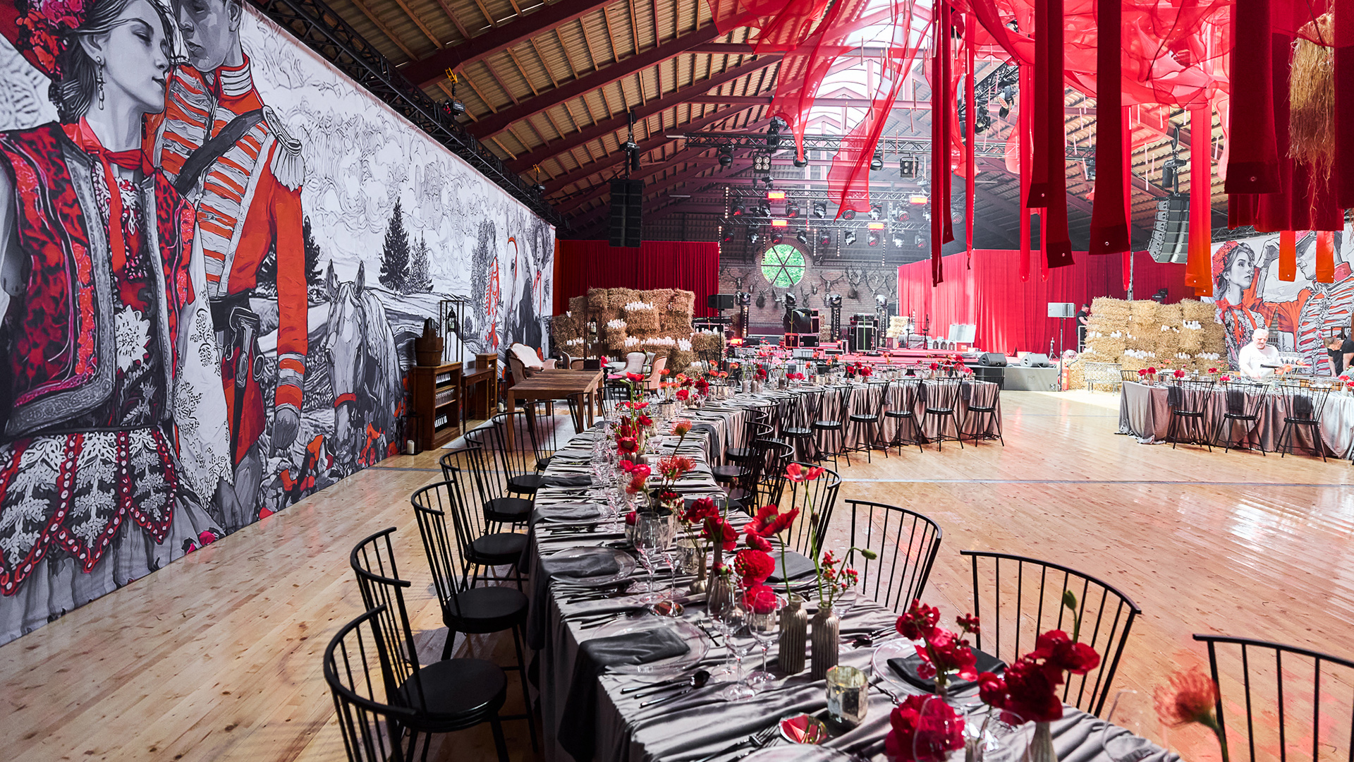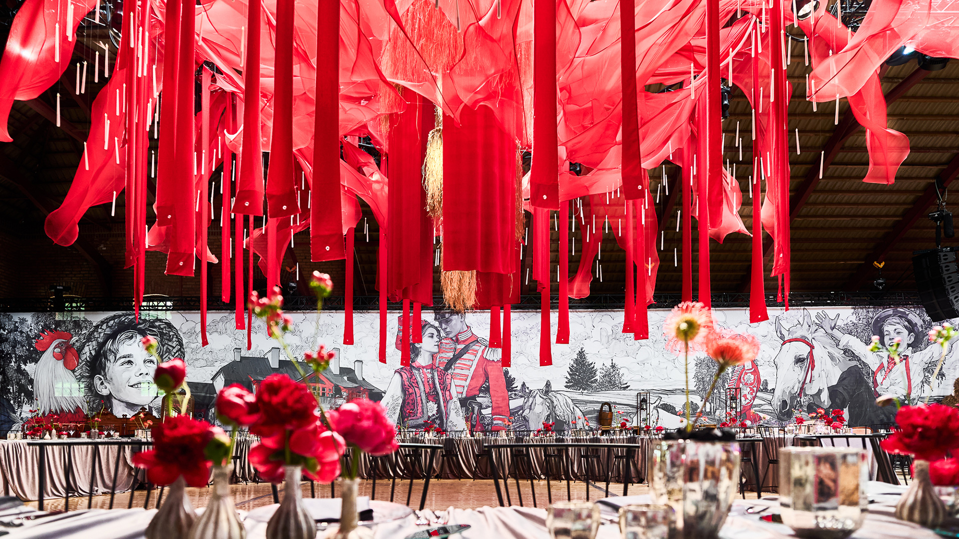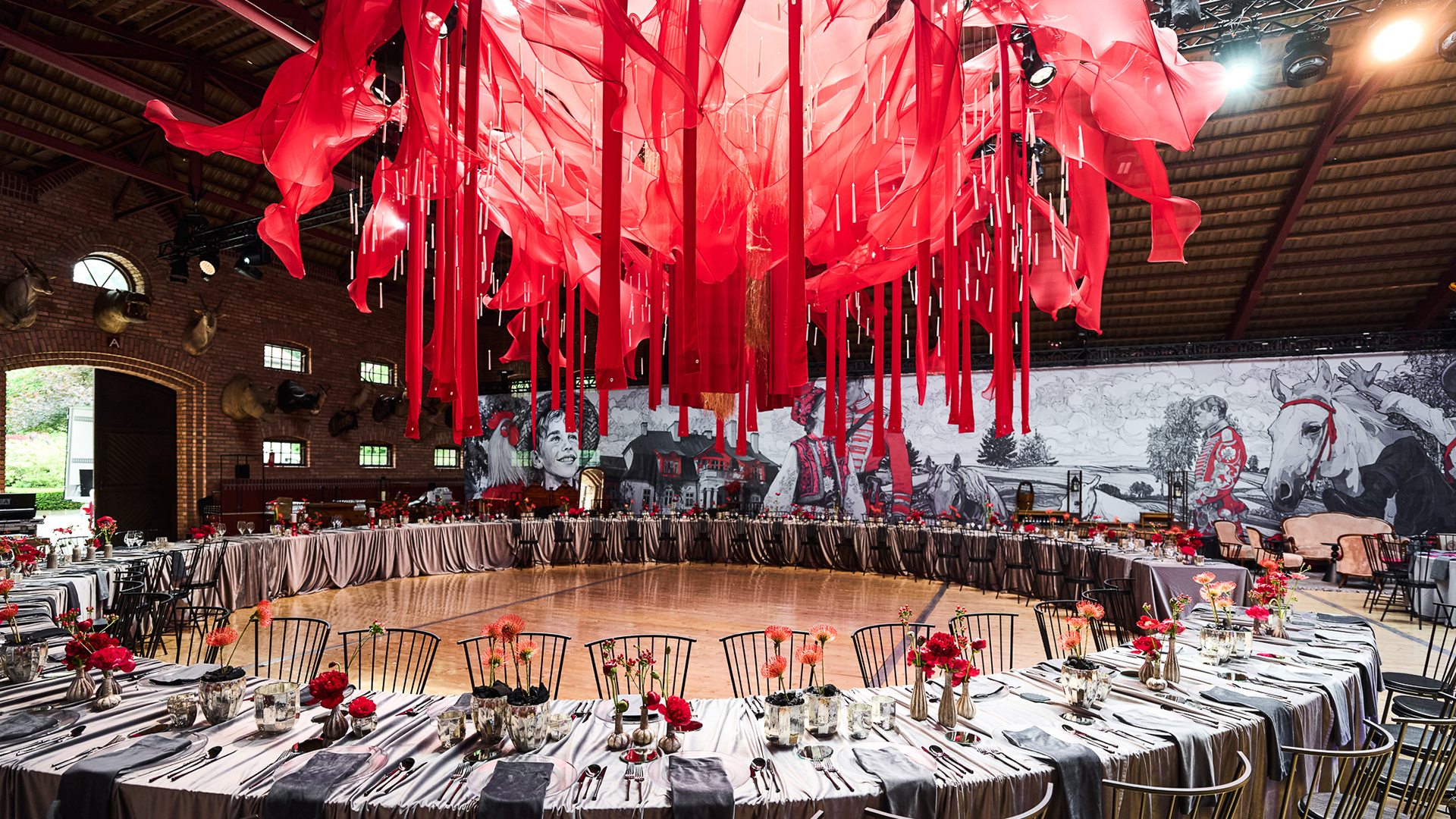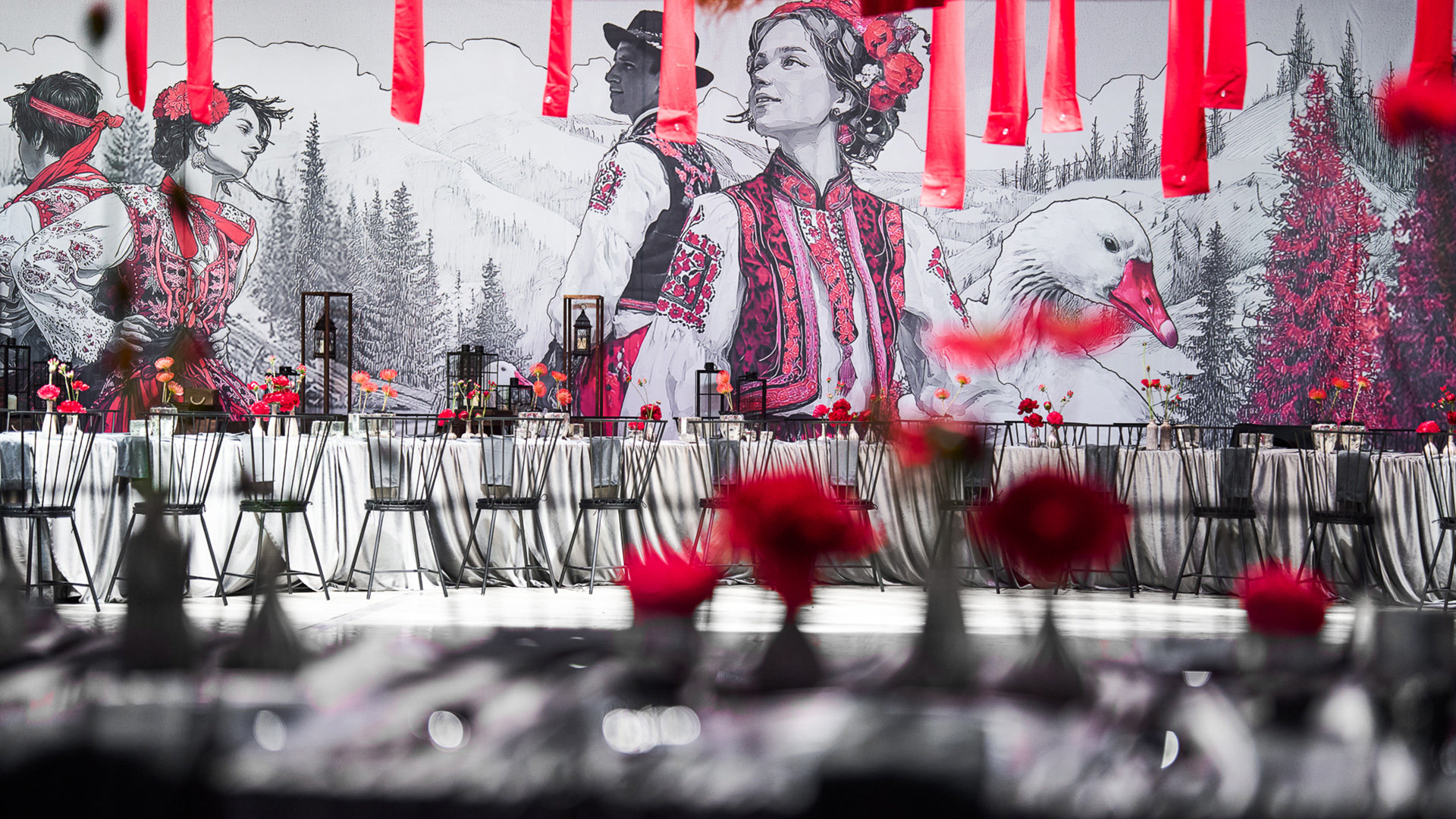 Kultura staropolska i kultura góralska, mężczyzna i kobieta oraz ich wspólne urodziny. Czy to da się pogodzić? Opracowanie graficzne było kluczowe w tym projekcie, gdzie wszystkie ściany otoczyła historia każdego z jubilatów. Wielki, okrągły stół scalił wszystkich gości a podwieszenie podkreślało uroczysty charakter przyjęcia. Grafit i czerwień, spokój i energia