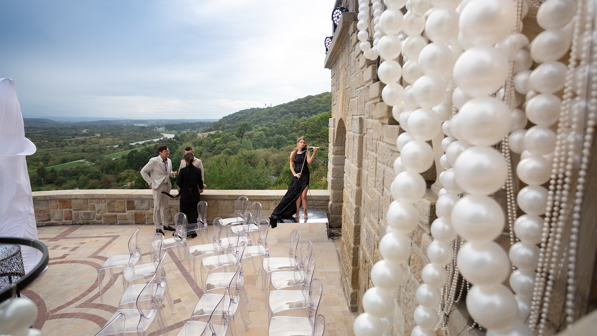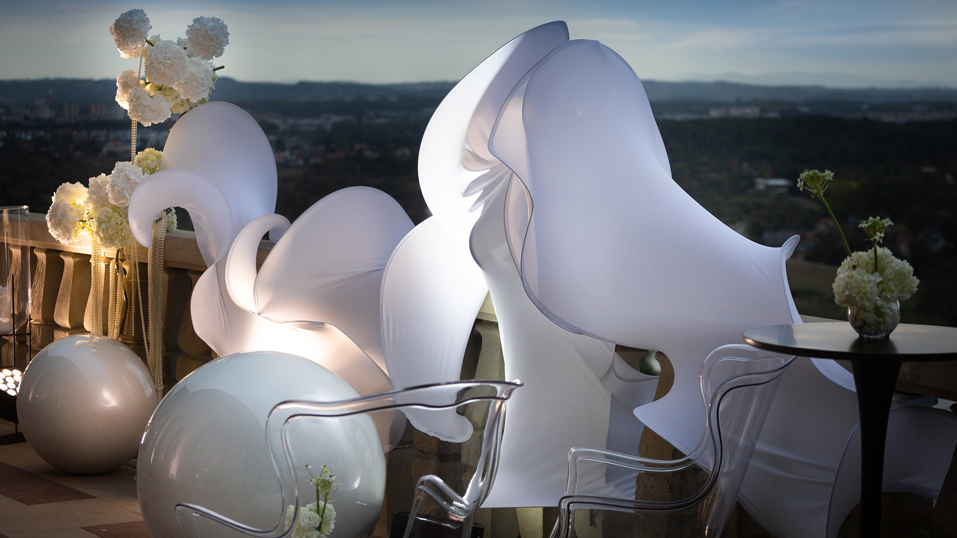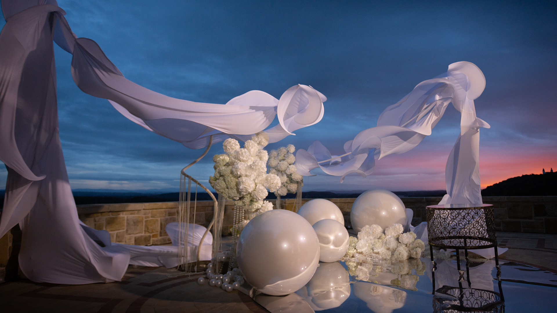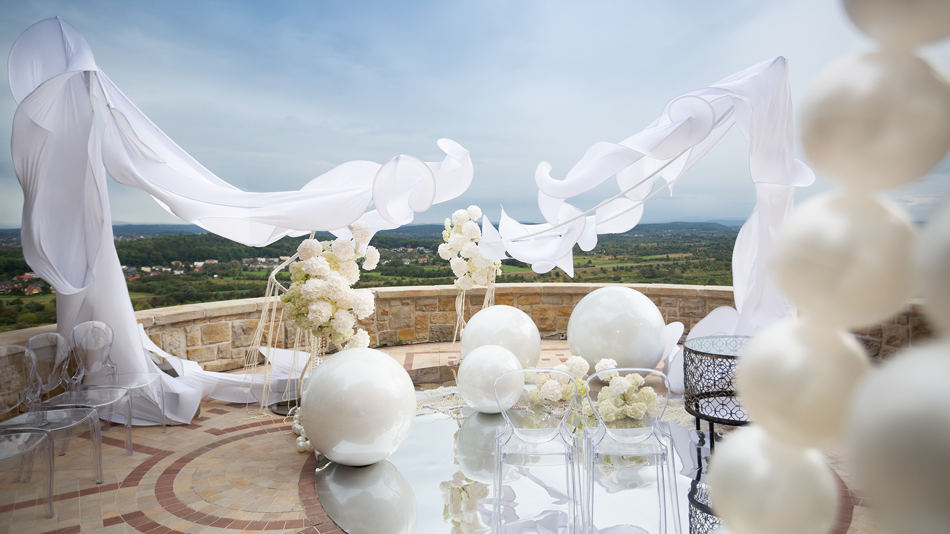 Artystyczny projekt wpisany w czystą biel, oparty o luksusowe tkaniny i ponadczasowe piękno szlachetnych pereł, delikatnego symbolu czystości i niewinności. Intrygująca stylizacja dopasowana do przepastnych zamkowych przestrzeni.