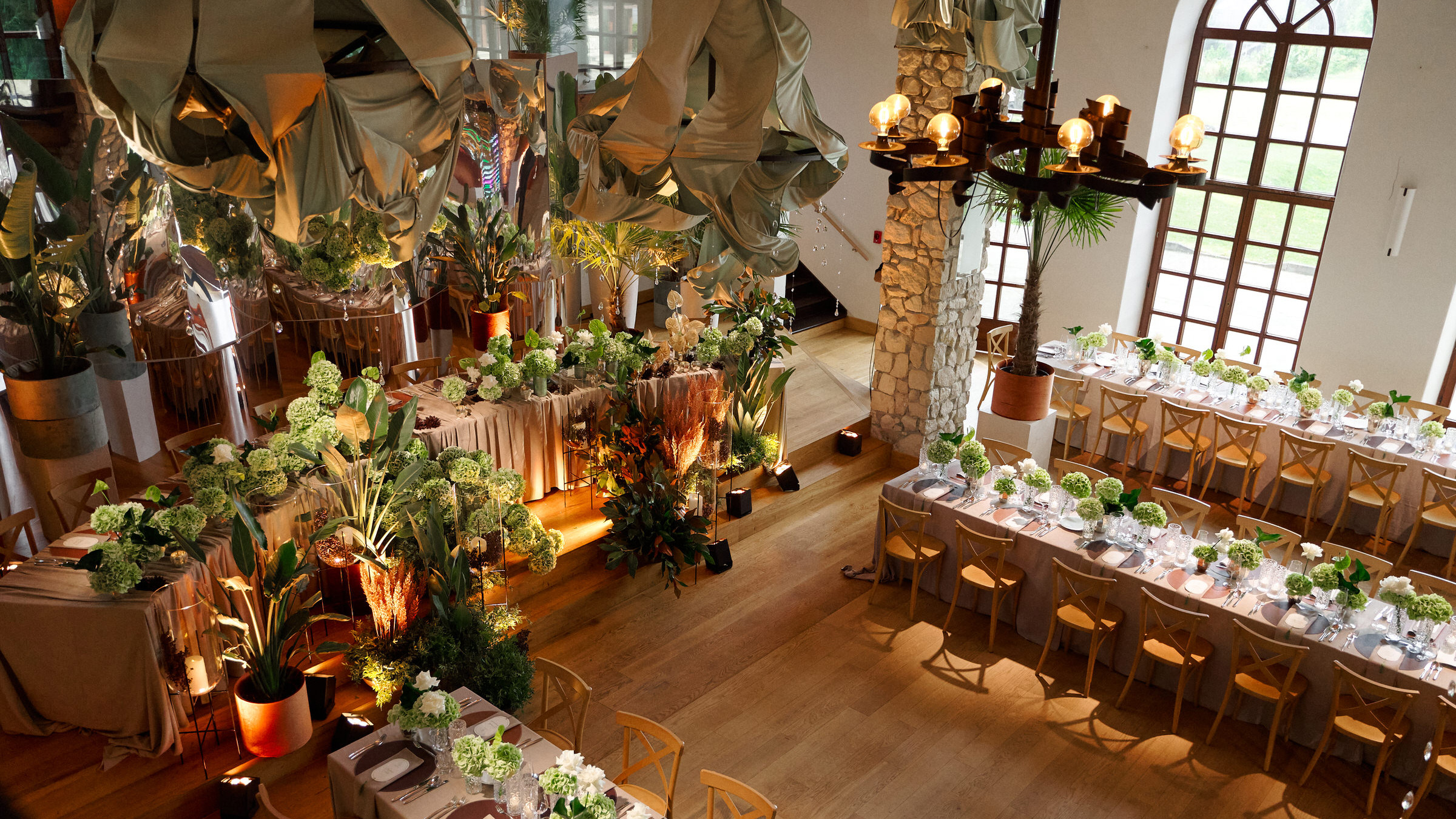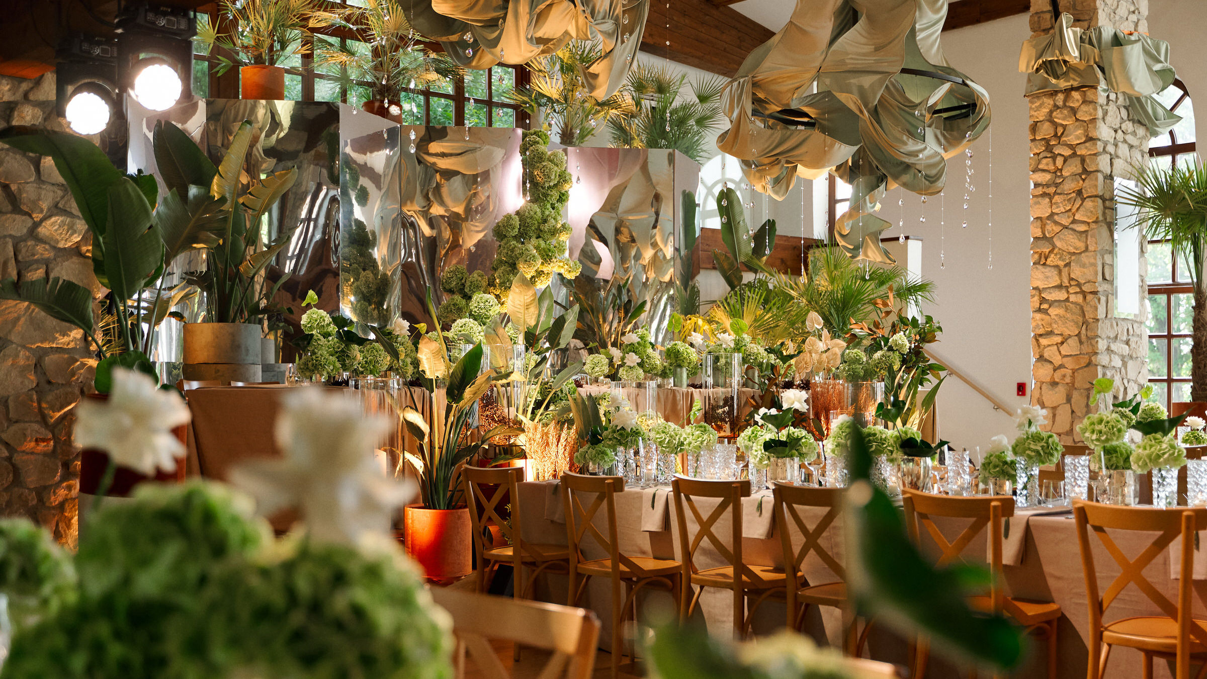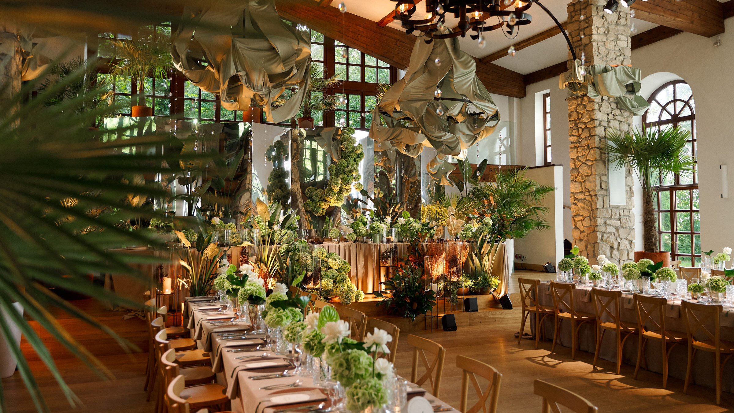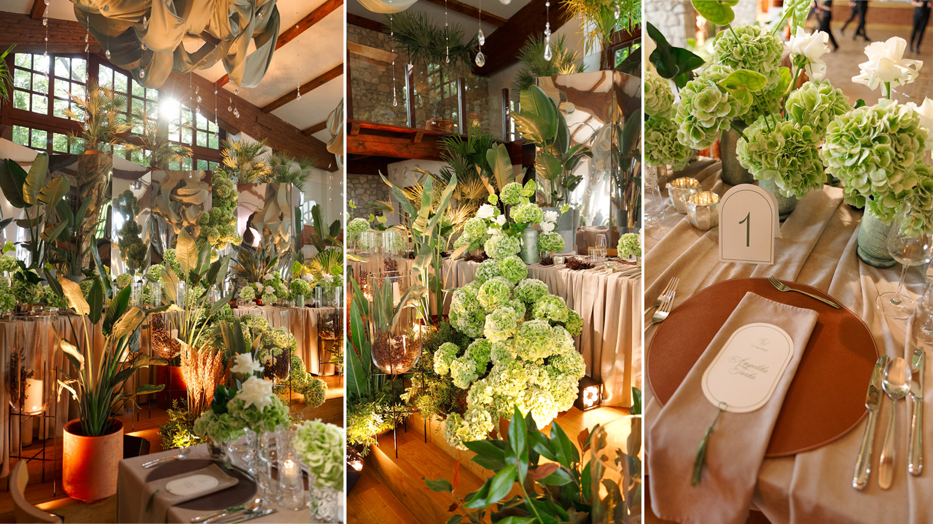 Napój orzeźwiający, kojarzący się nieco z tropikami, zieleń i czekolada oraz pomarańcz zachodzącego słońca – brzmi smacznie. Projekt przeznaczony do dużej, wysokiej i monumentalnej Sali. Zakątki, zakamarki, strefy – przypominające lobby jakiegoś niezwykłego egzotycznego hotelu. Kwiaty luksusowe, obrusy i dodatki również.
