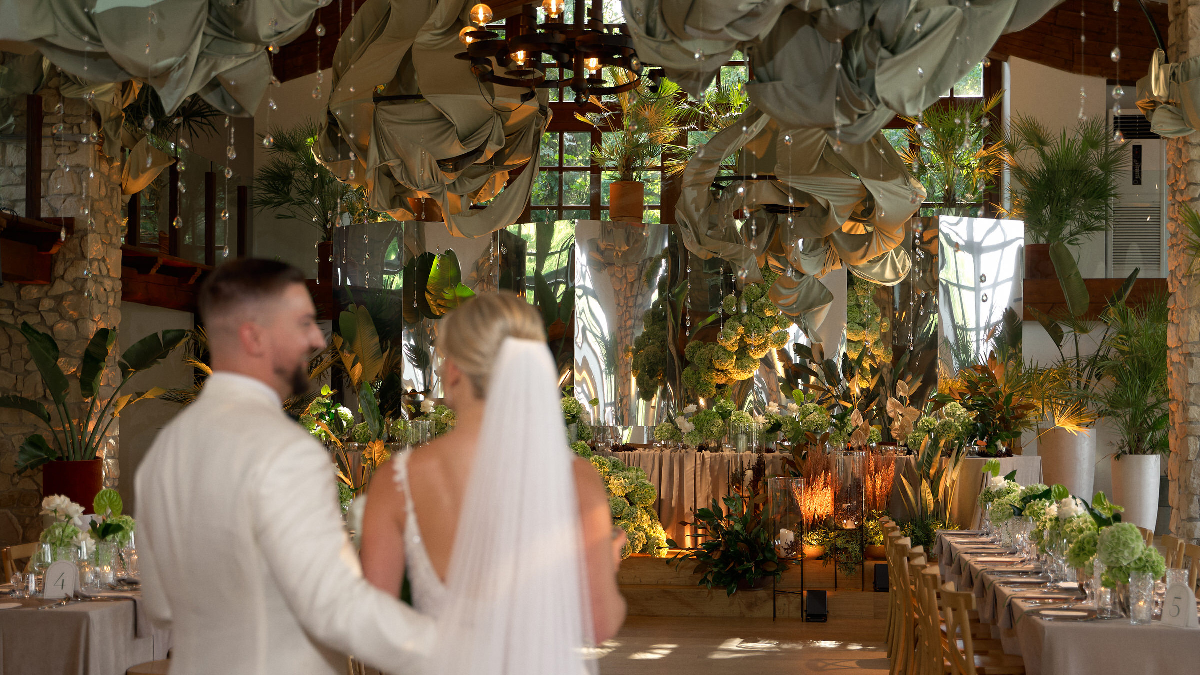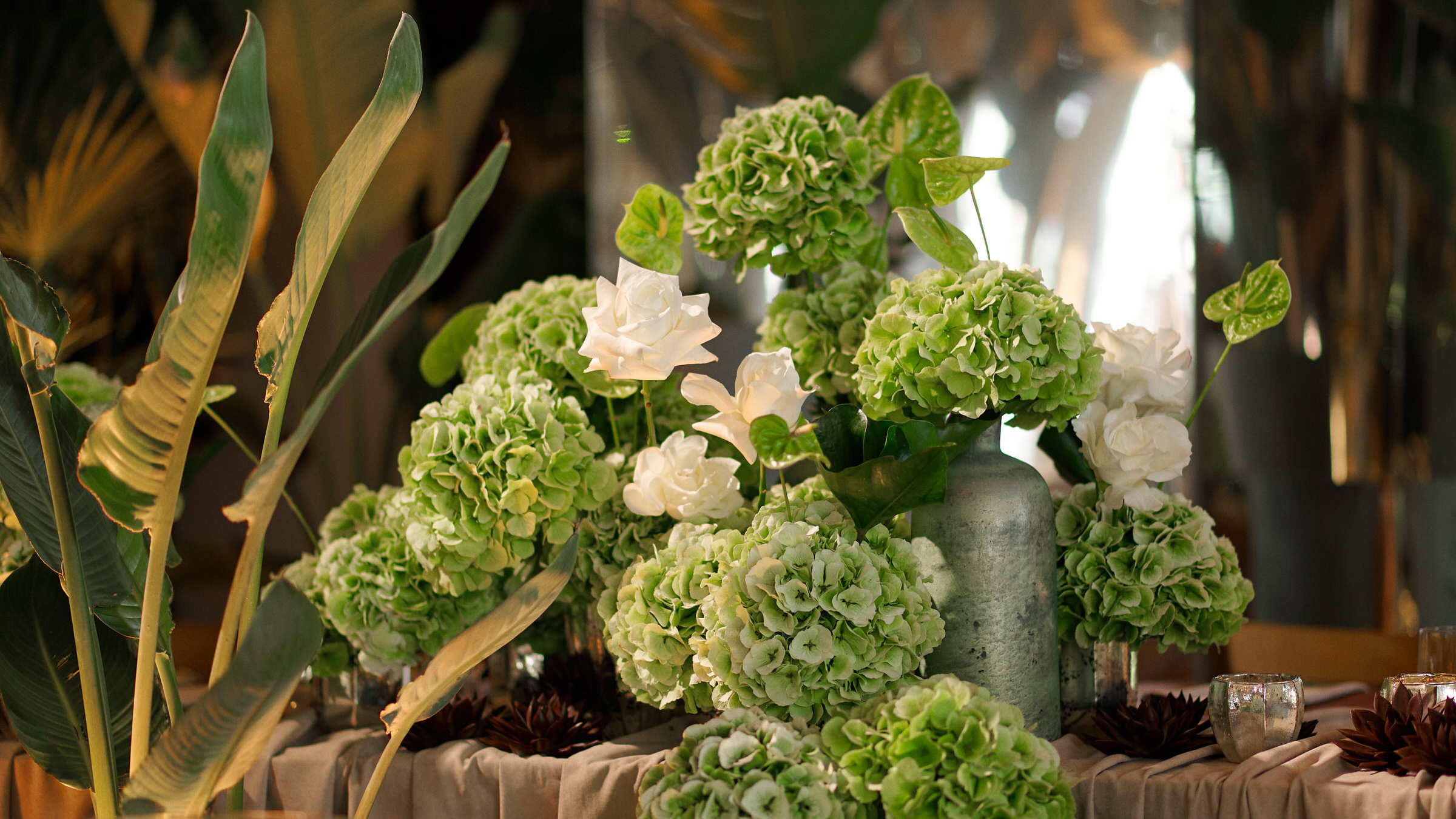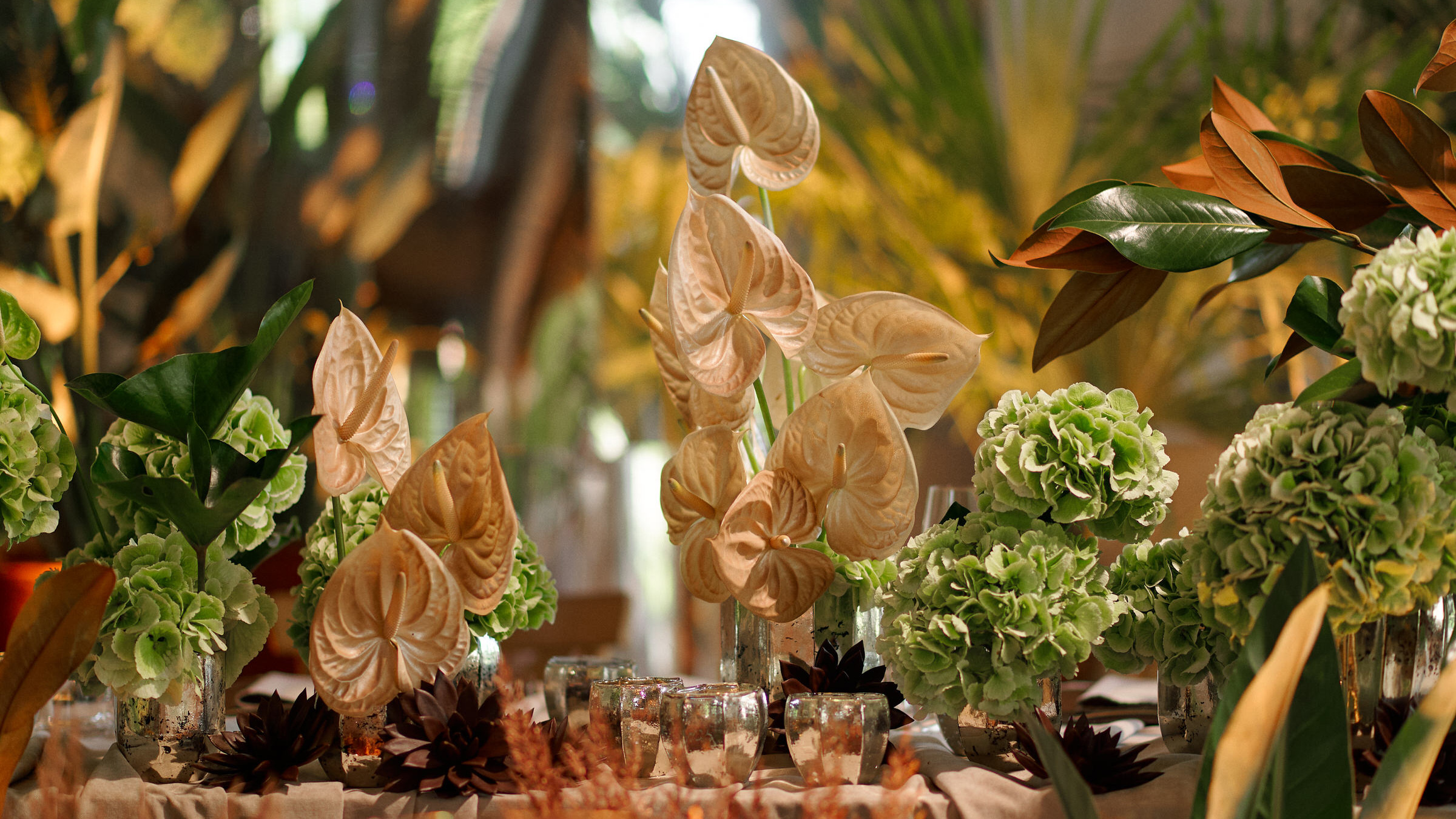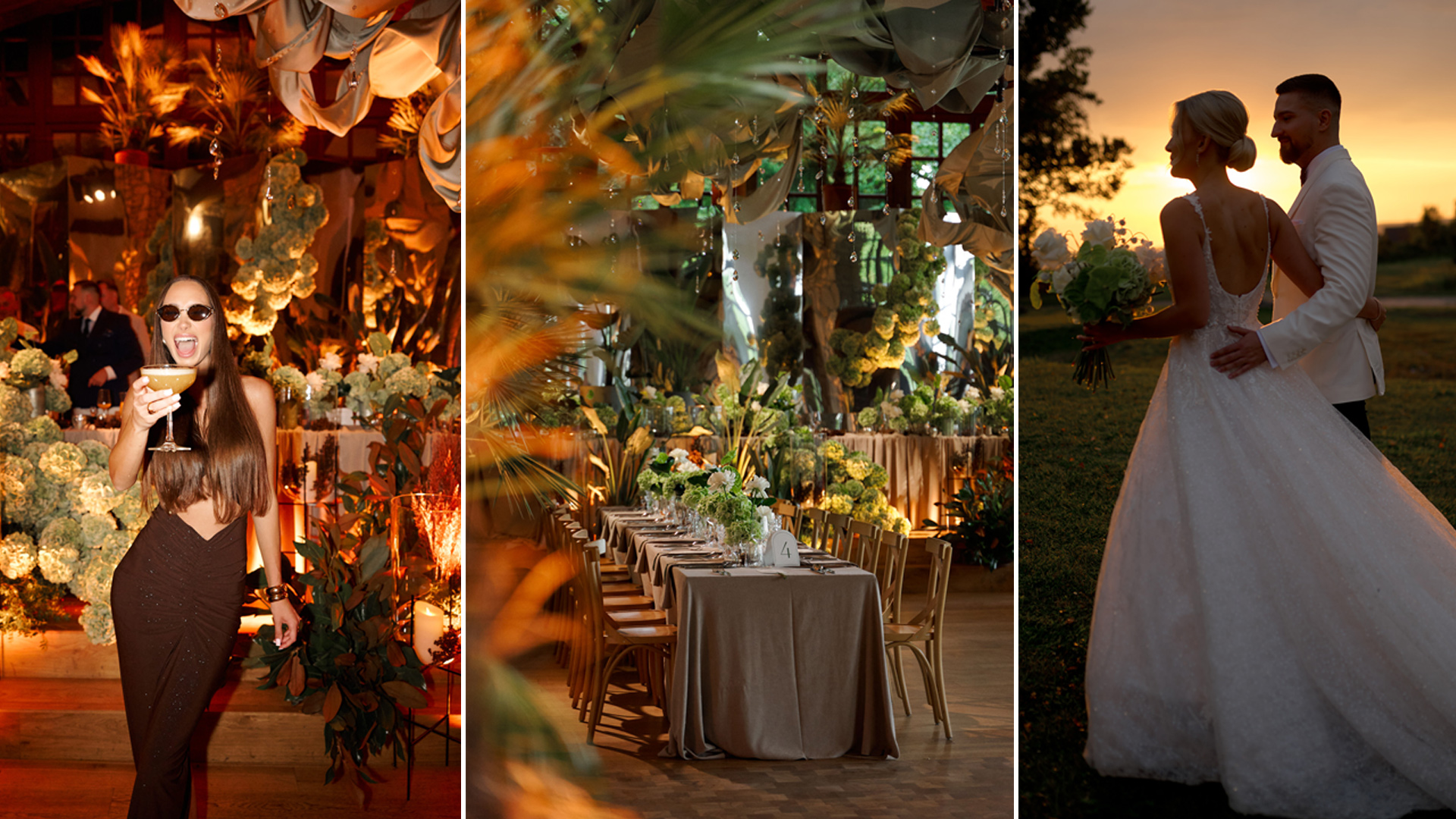 Napój orzeźwiający, kojarzący się nieco z tropikami, zieleń i czekolada oraz pomarańcz zachodzącego słońca – brzmi smacznie. Projekt przeznaczony do dużej, wysokiej i monumentalnej Sali. Zakątki, zakamarki, strefy – przypominające lobby jakiegoś niezwykłego egzotycznego hotelu. Kwiaty luksusowe, obrusy i dodatki również.