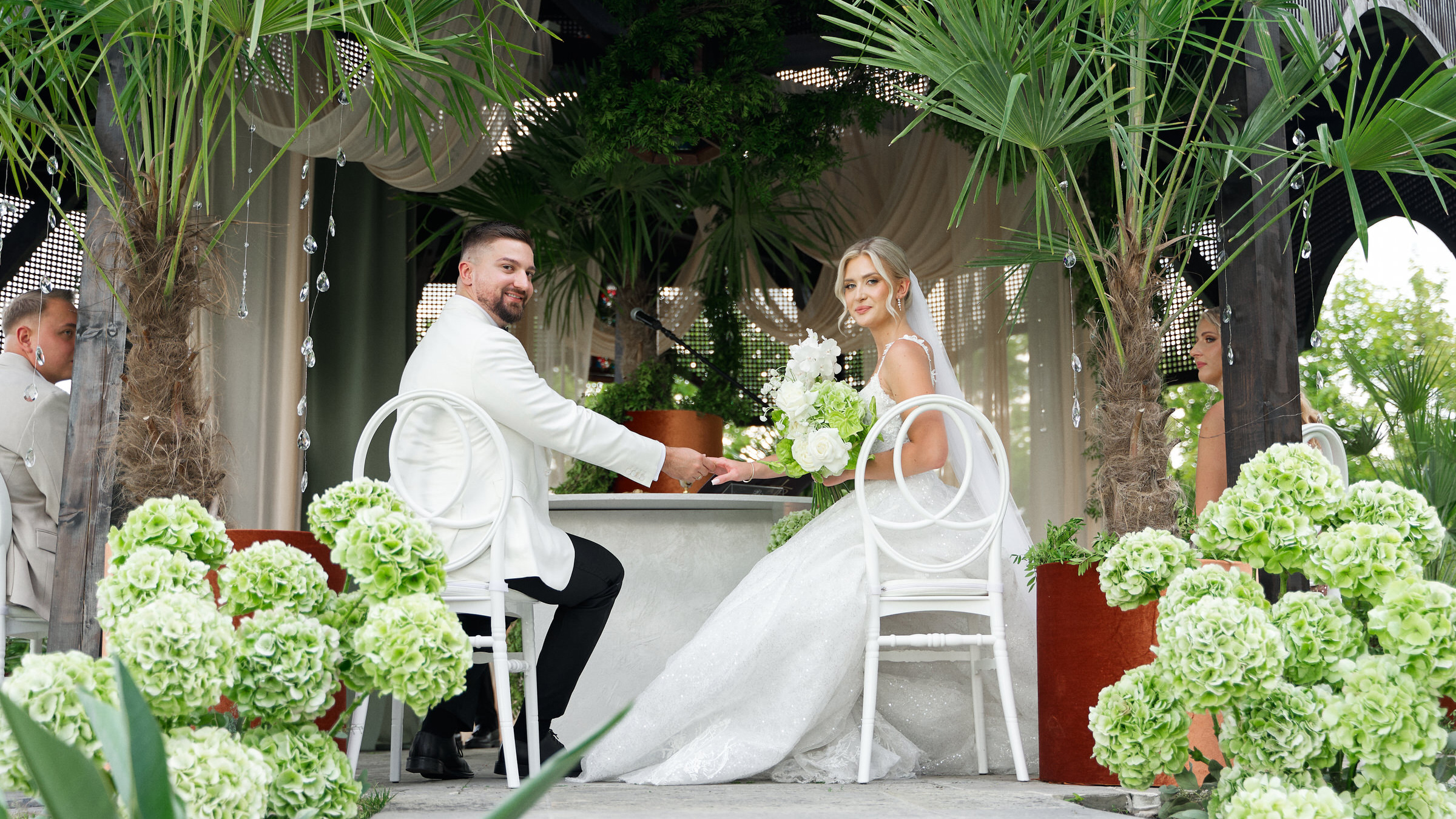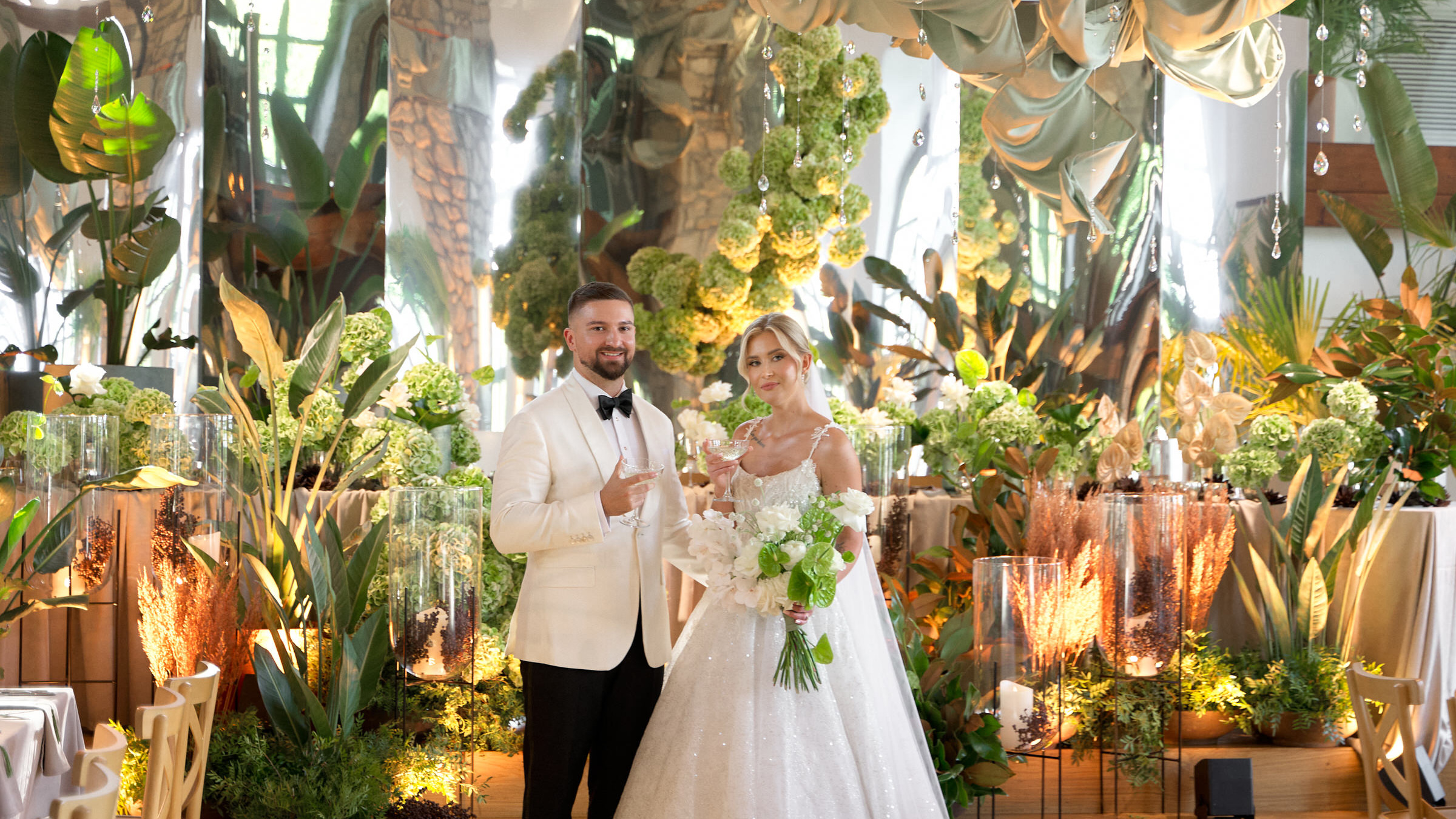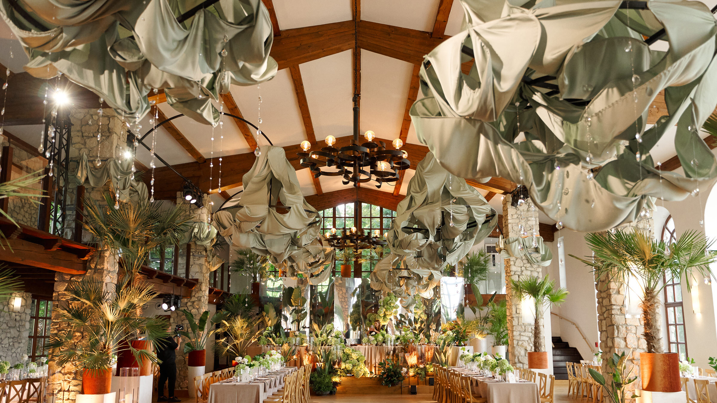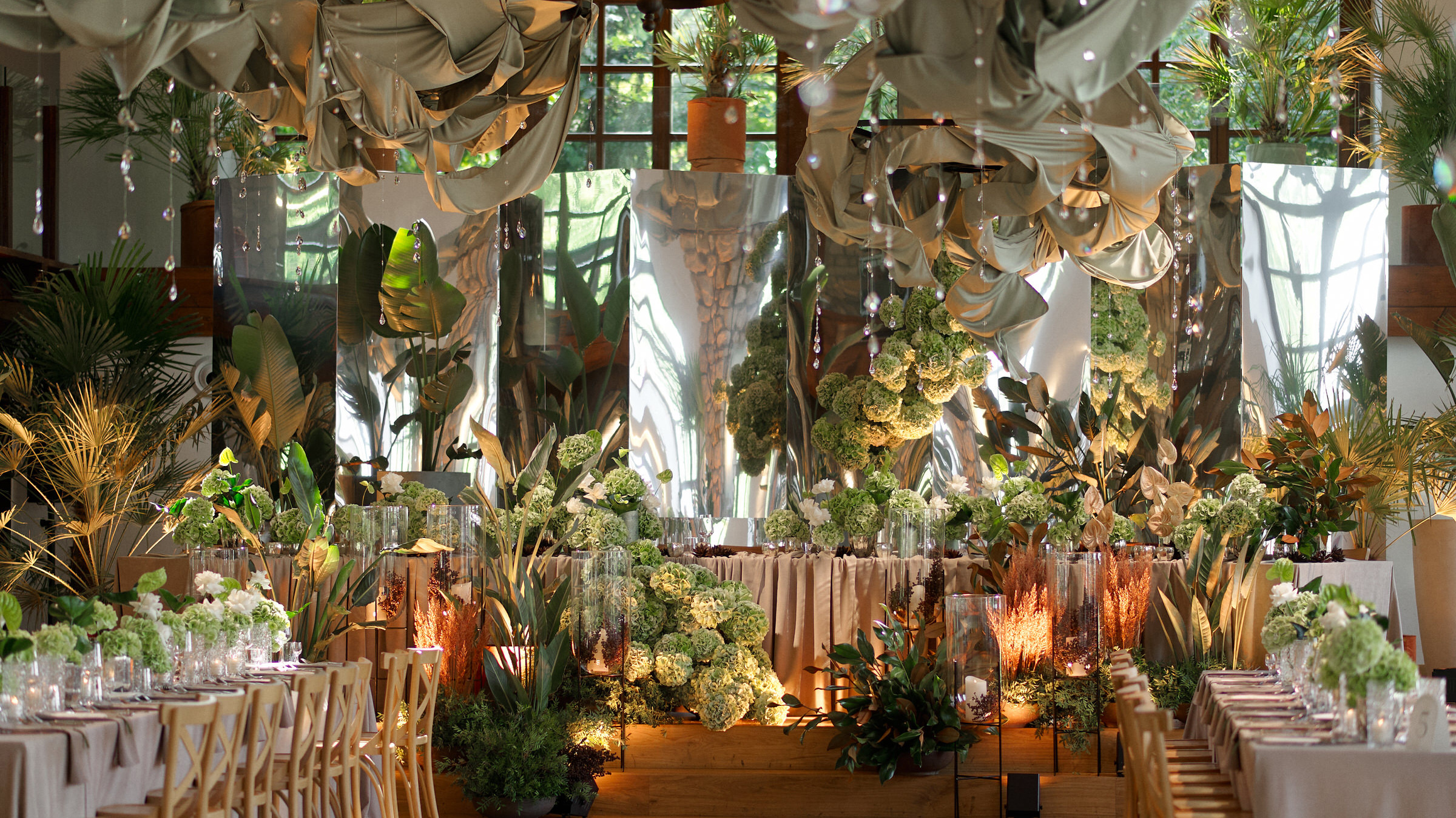 Napój orzeźwiający, kojarzący się nieco z tropikami, zieleń i czekolada oraz pomarańcz zachodzącego słońca – brzmi smacznie. Projekt przeznaczony do dużej, wysokiej i monumentalnej Sali. Zakątki, zakamarki, strefy – przypominające lobby jakiegoś niezwykłego egzotycznego hotelu. Kwiaty luksusowe, obrusy i dodatki również.