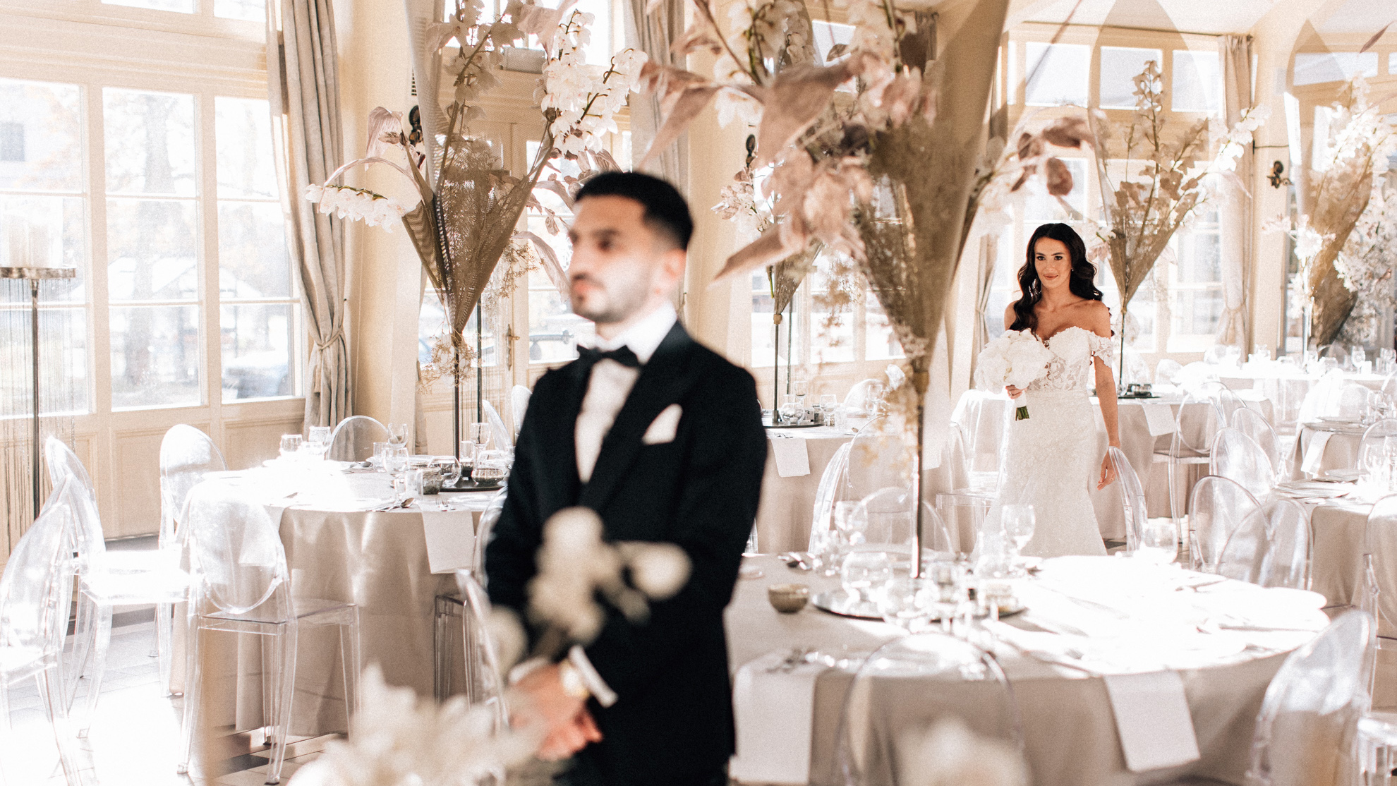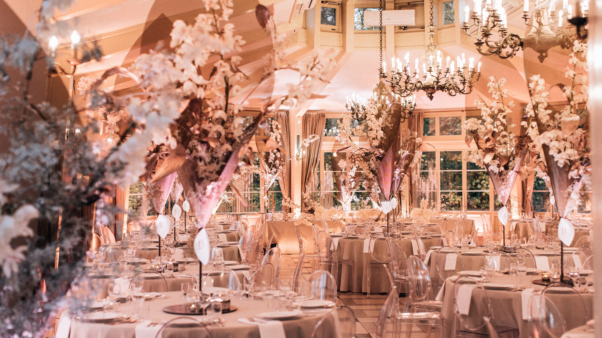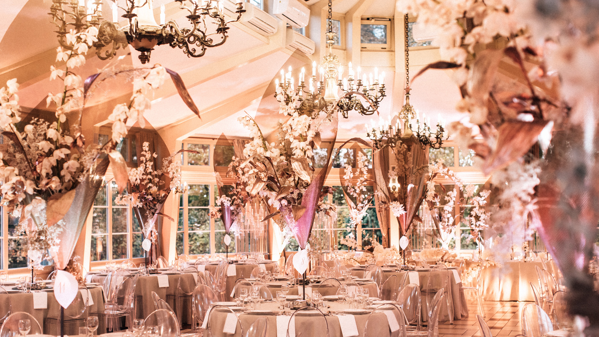 Elegancja może mieć różne oblicza. Kluczem do projektu były przeskalowane, szampanowe liście, których urok dopełniły luksusowe orchidee. Mocna i nieco surrealistyczna stylizacja, utrzymująca urzekającą harmonię z obiektem.