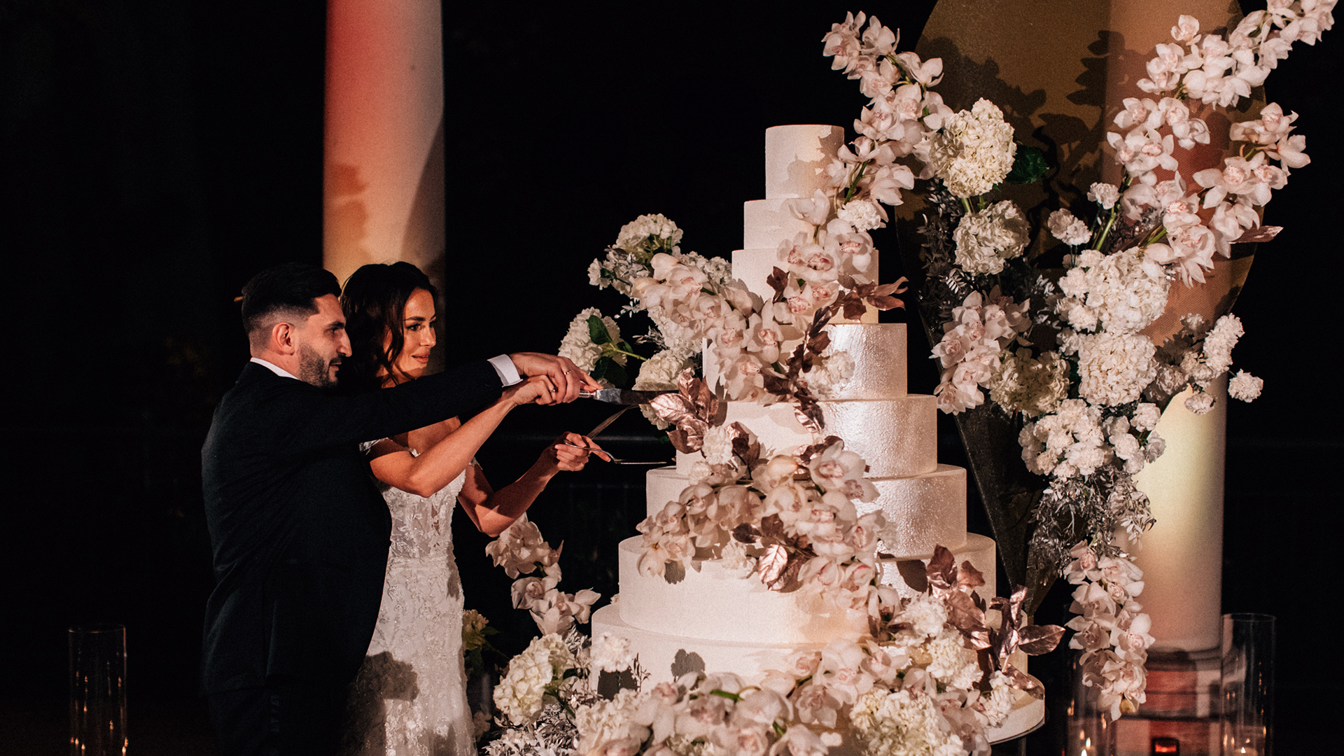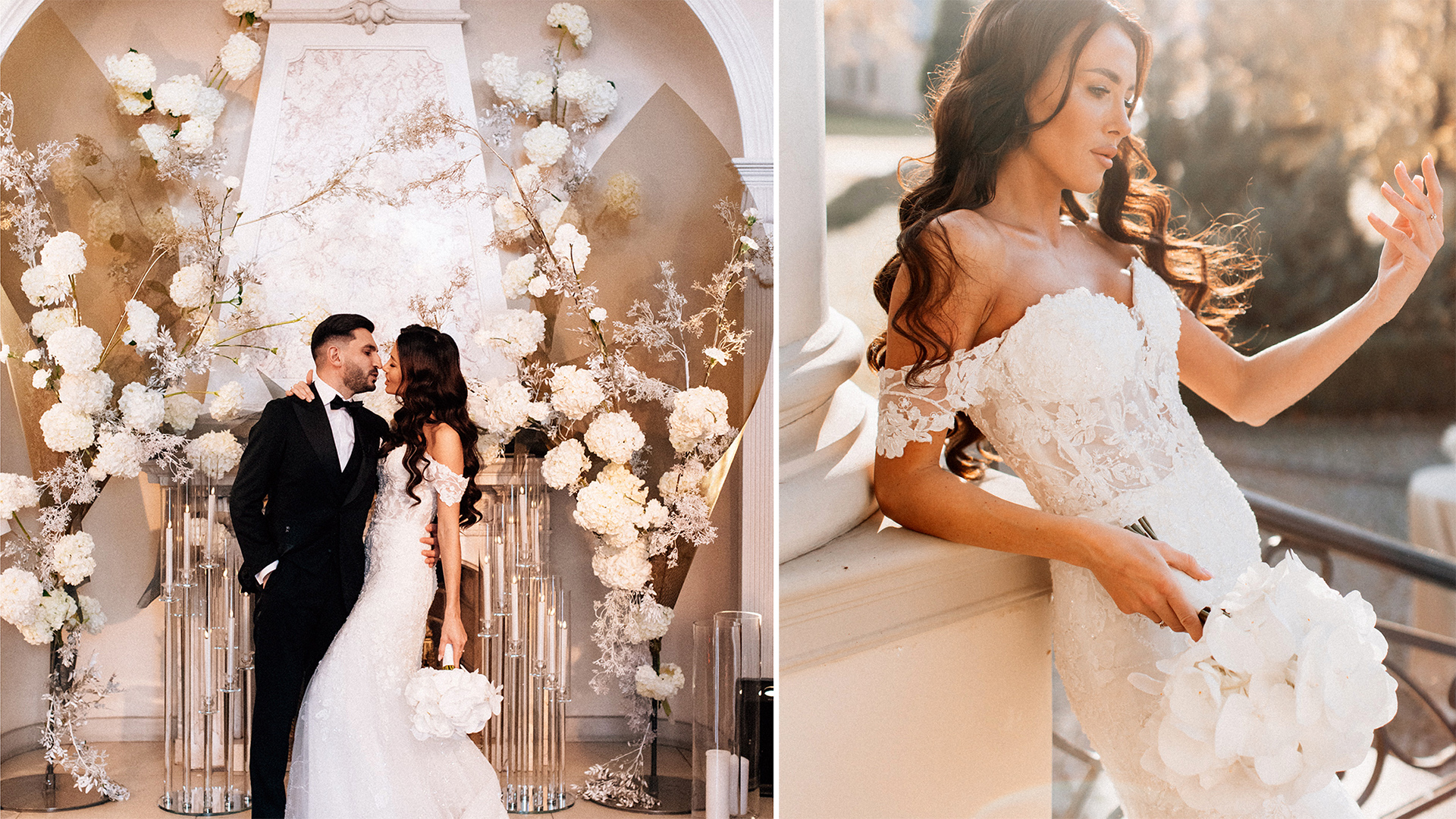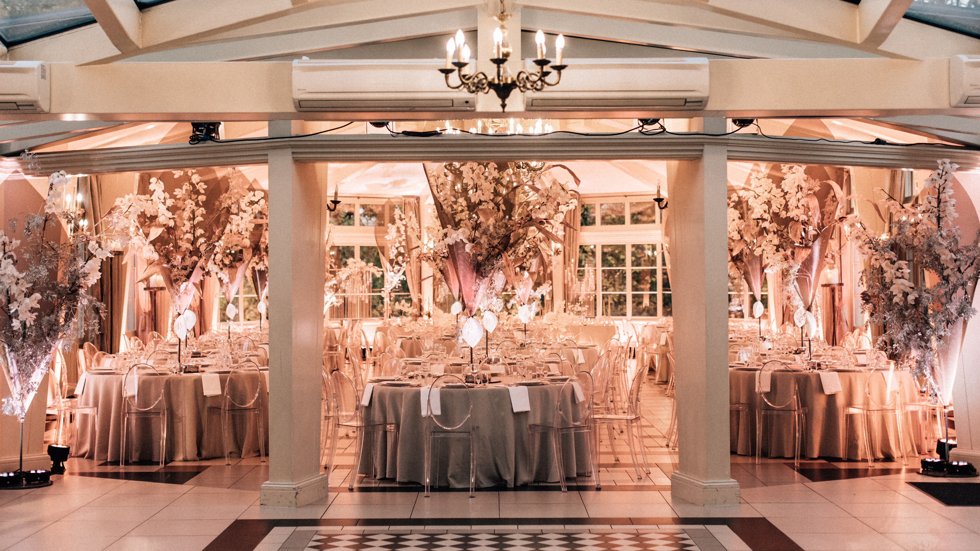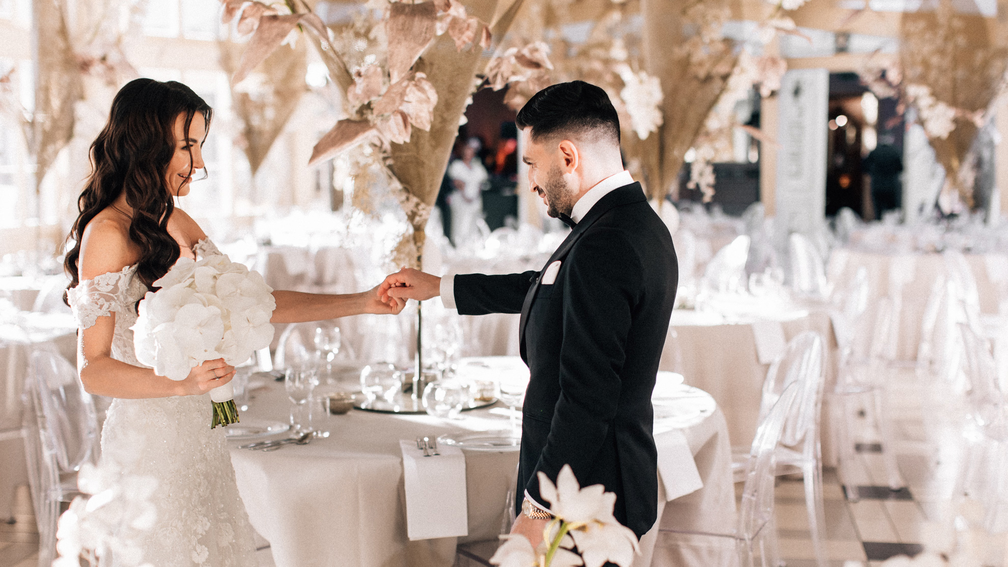 Elegancja może mieć różne oblicza. Kluczem do projektu były przeskalowane, szampanowe liście, których urok dopełniły luksusowe orchidee. Mocna i nieco surrealistyczna stylizacja, utrzymująca urzekającą harmonię z obiektem.