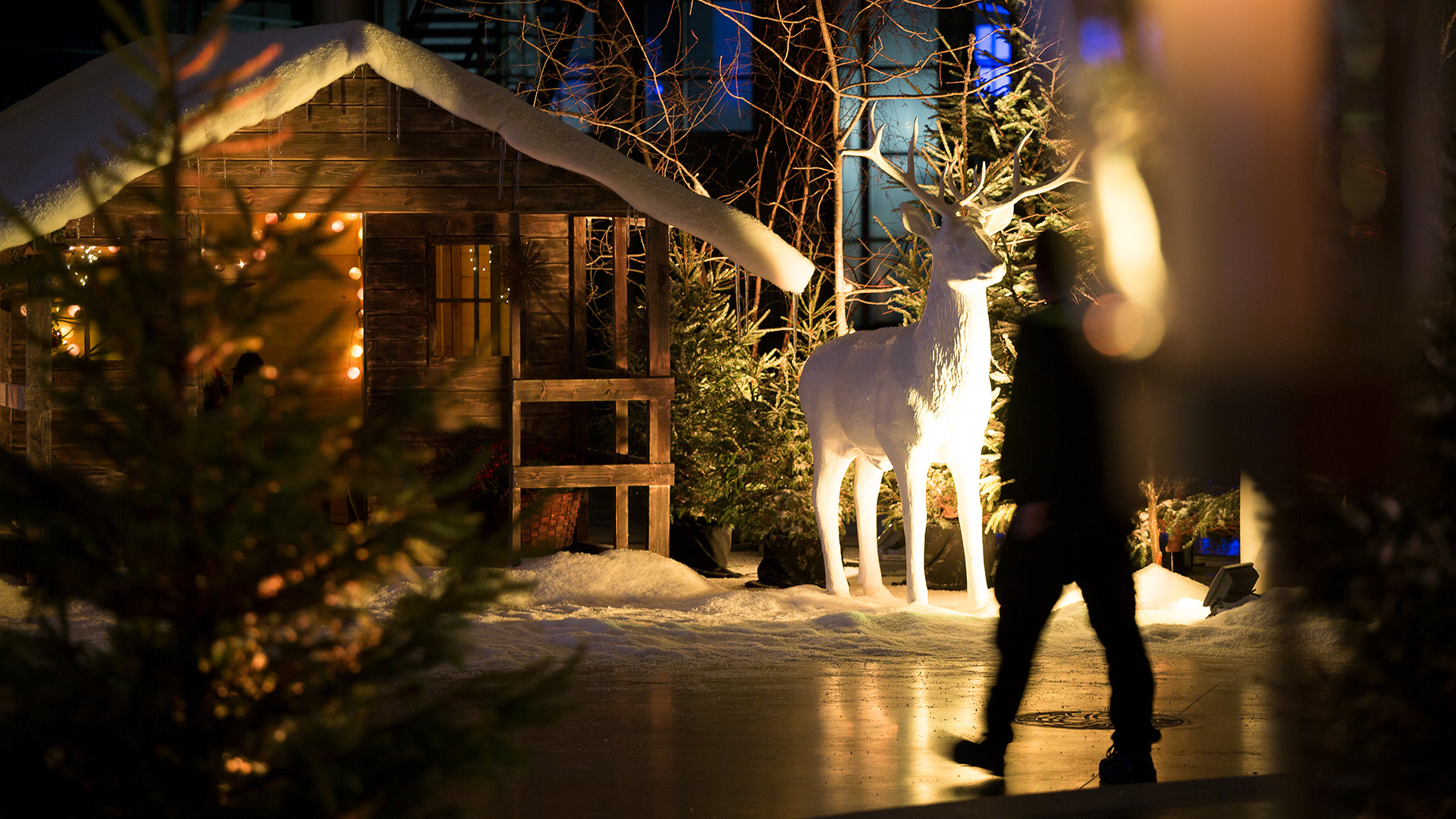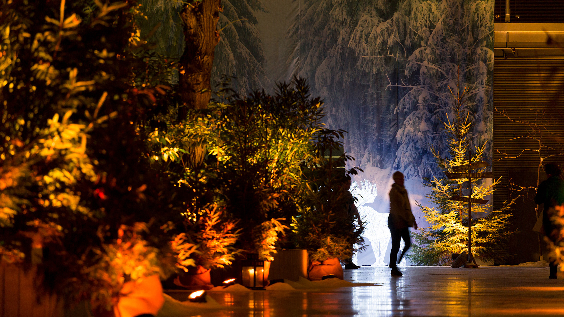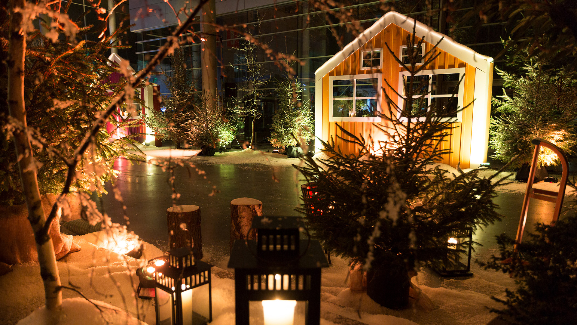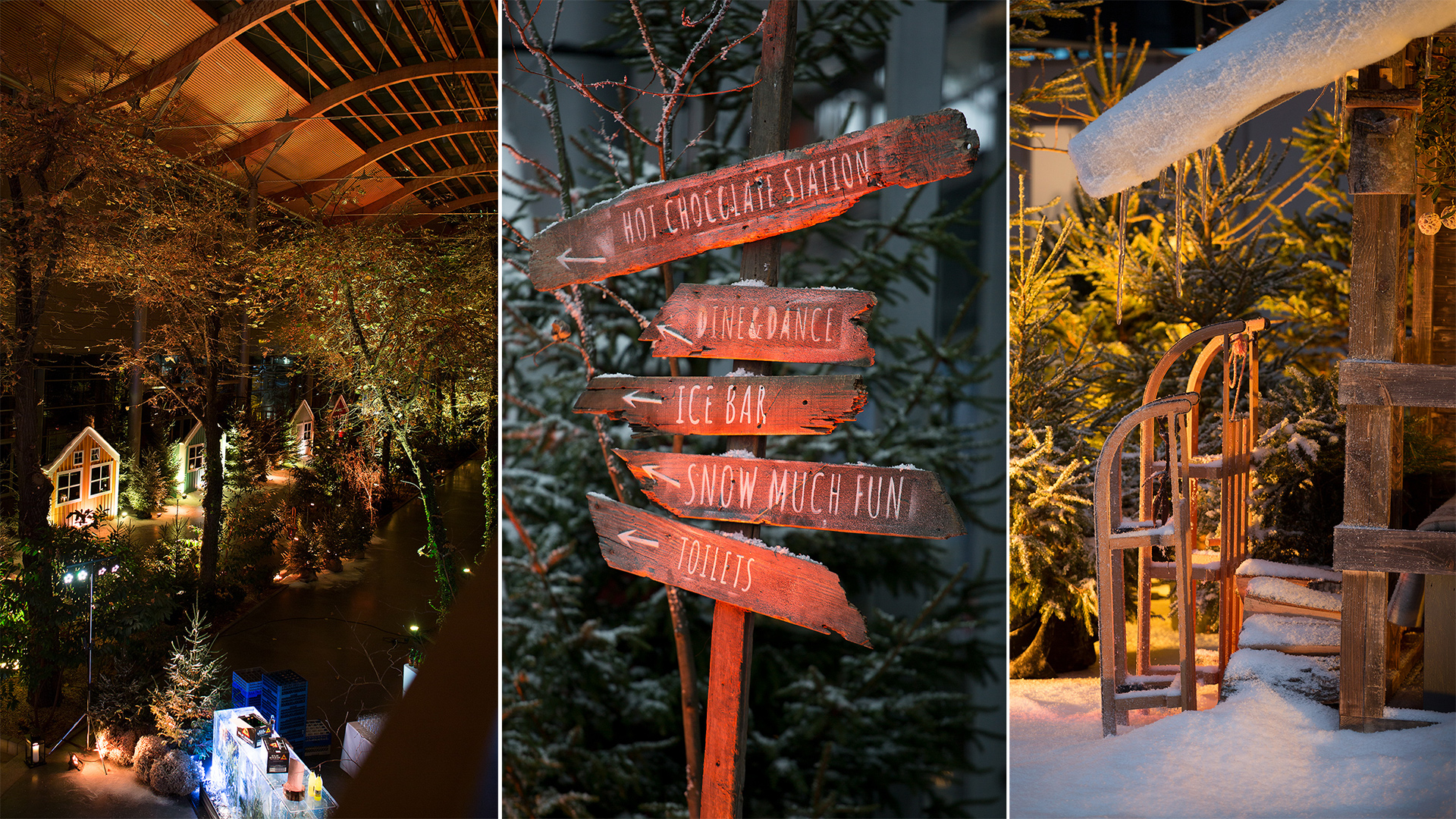 Eventowa przestrzeń zamieniona w skandynawskie miasteczko. Czapy śniegu na dacham i drzewach, przytulne zakątki, wszystko to sprawia, że czujemy się jak przeniesieni do grudniowego Bergen, rozświetlonego pomimo polarnych ciemności. Sanie, renifry, lampiony, w taki świat każdy chętnie się przeniesie, choćby na jedną noc