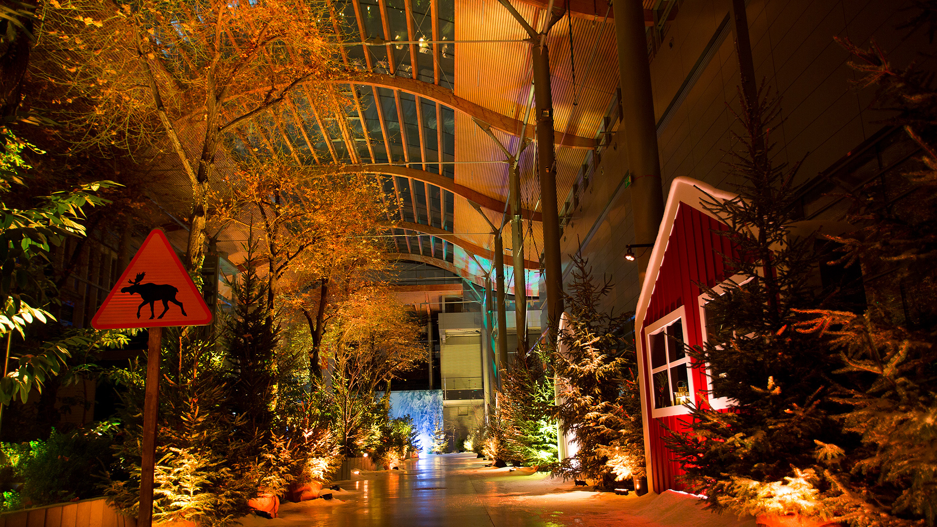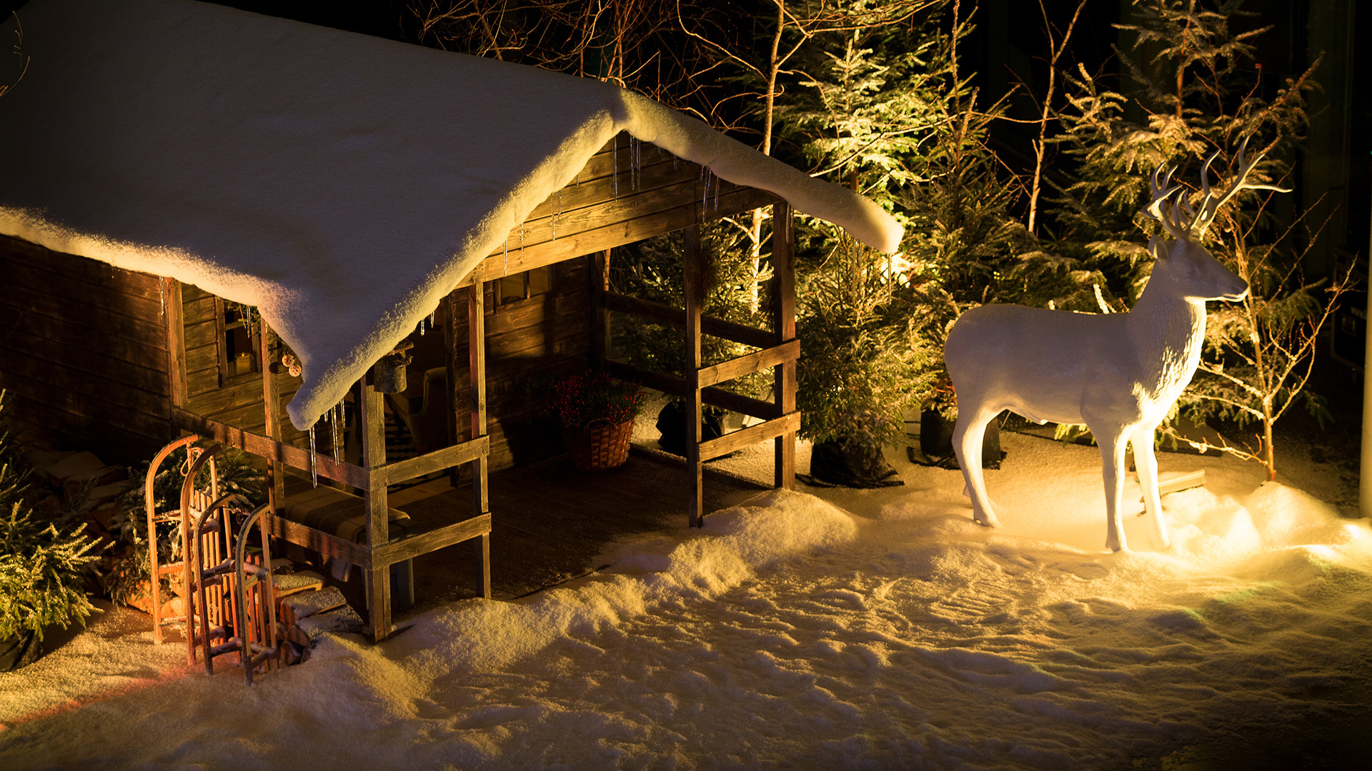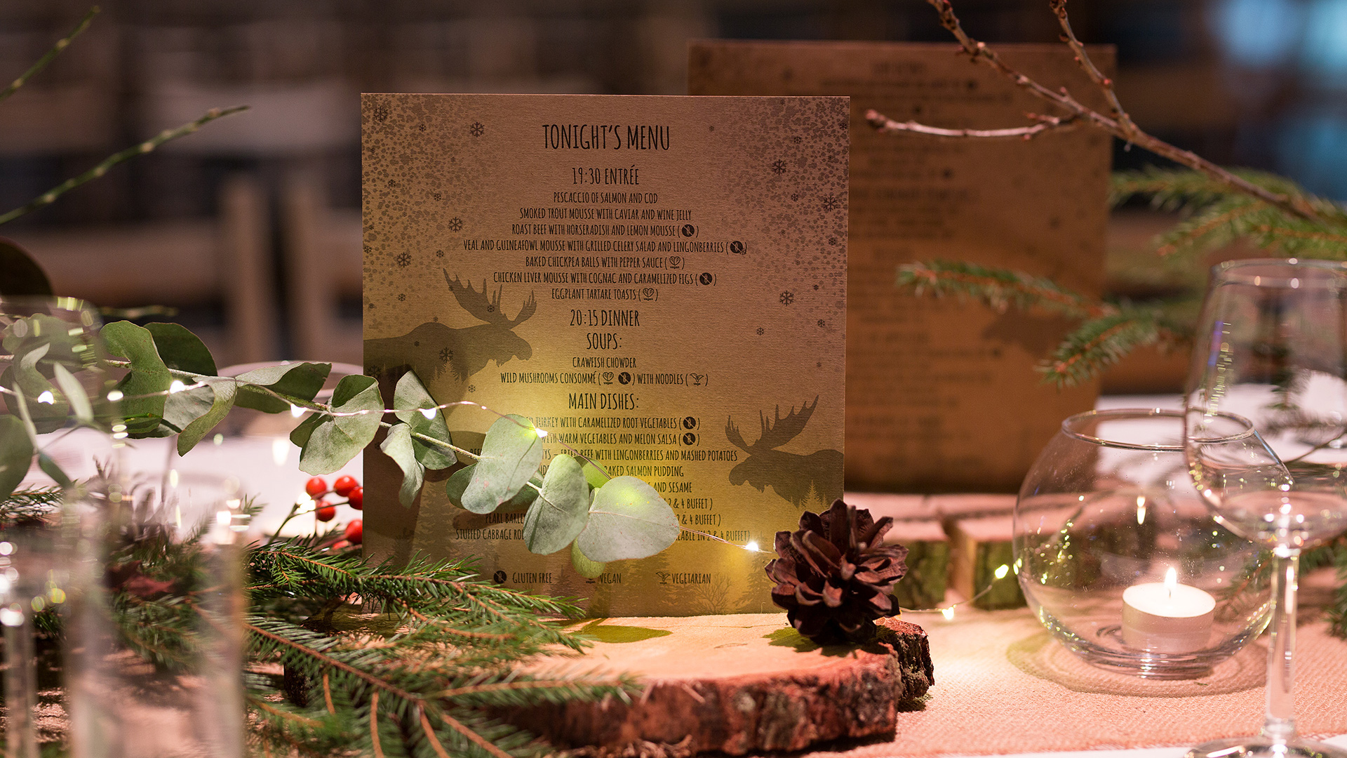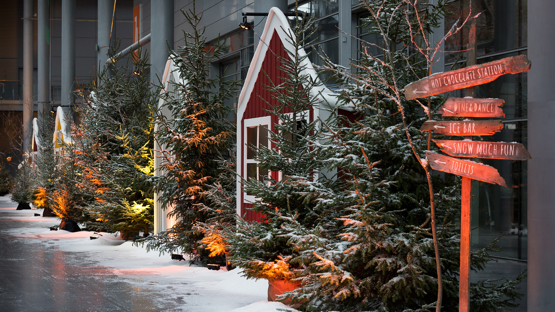 Eventowa przestrzeń zamieniona w skandynawskie miasteczko. Czapy śniegu na dacham i drzewach, przytulne zakątki, wszystko to sprawia, że czujemy się jak przeniesieni do grudniowego Bergen, rozświetlonego pomimo polarnych ciemności. Sanie, renifry, lampiony, w taki świat każdy chętnie się przeniesie, choćby na jedną noc