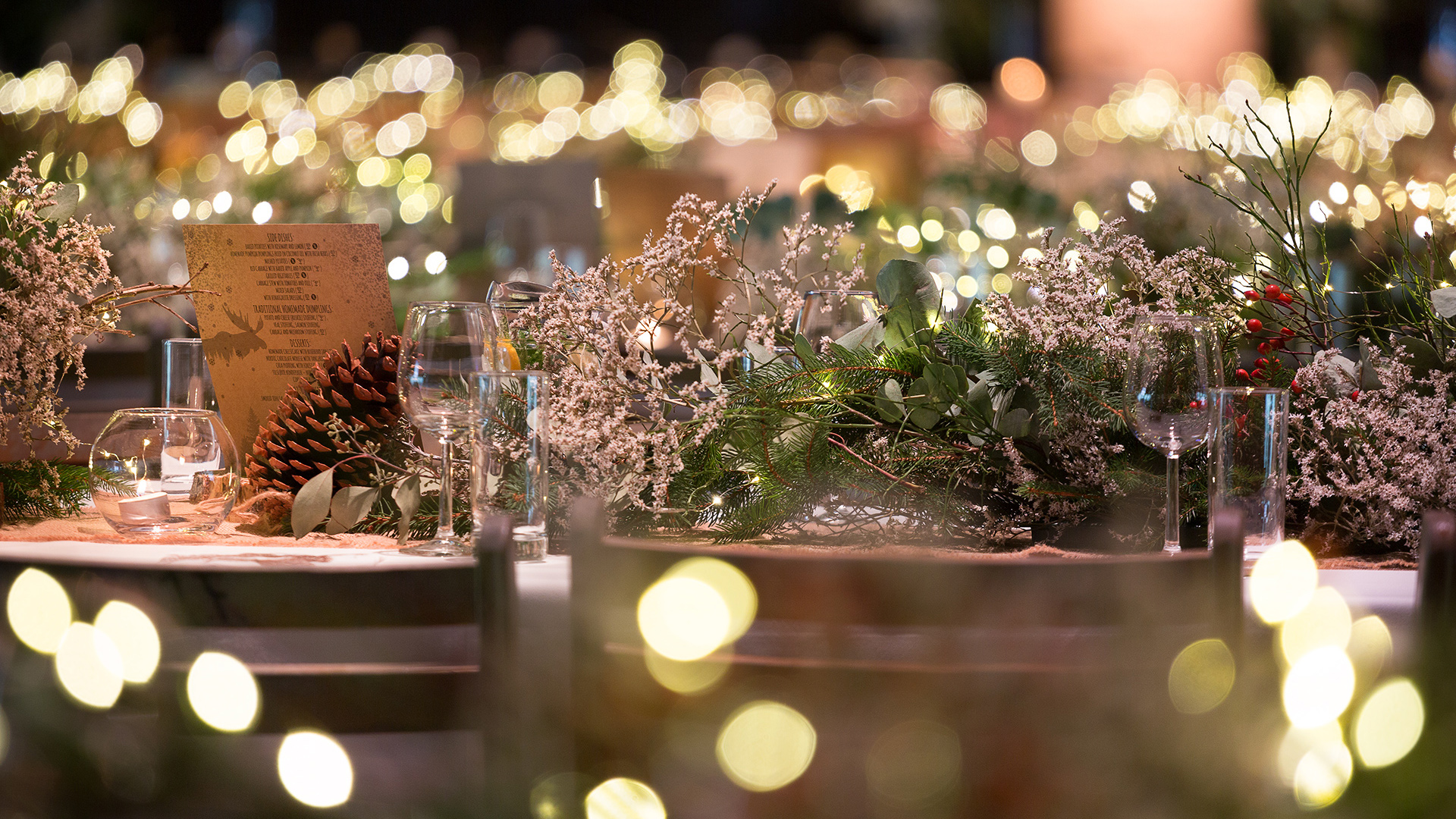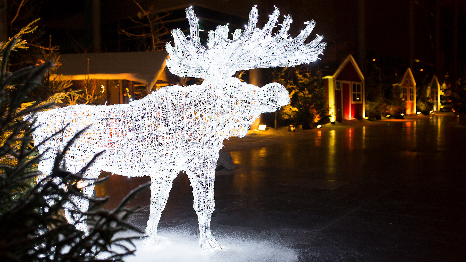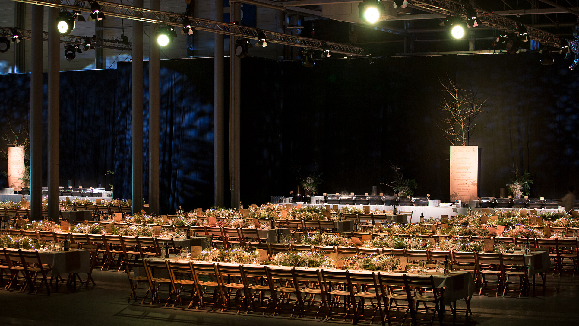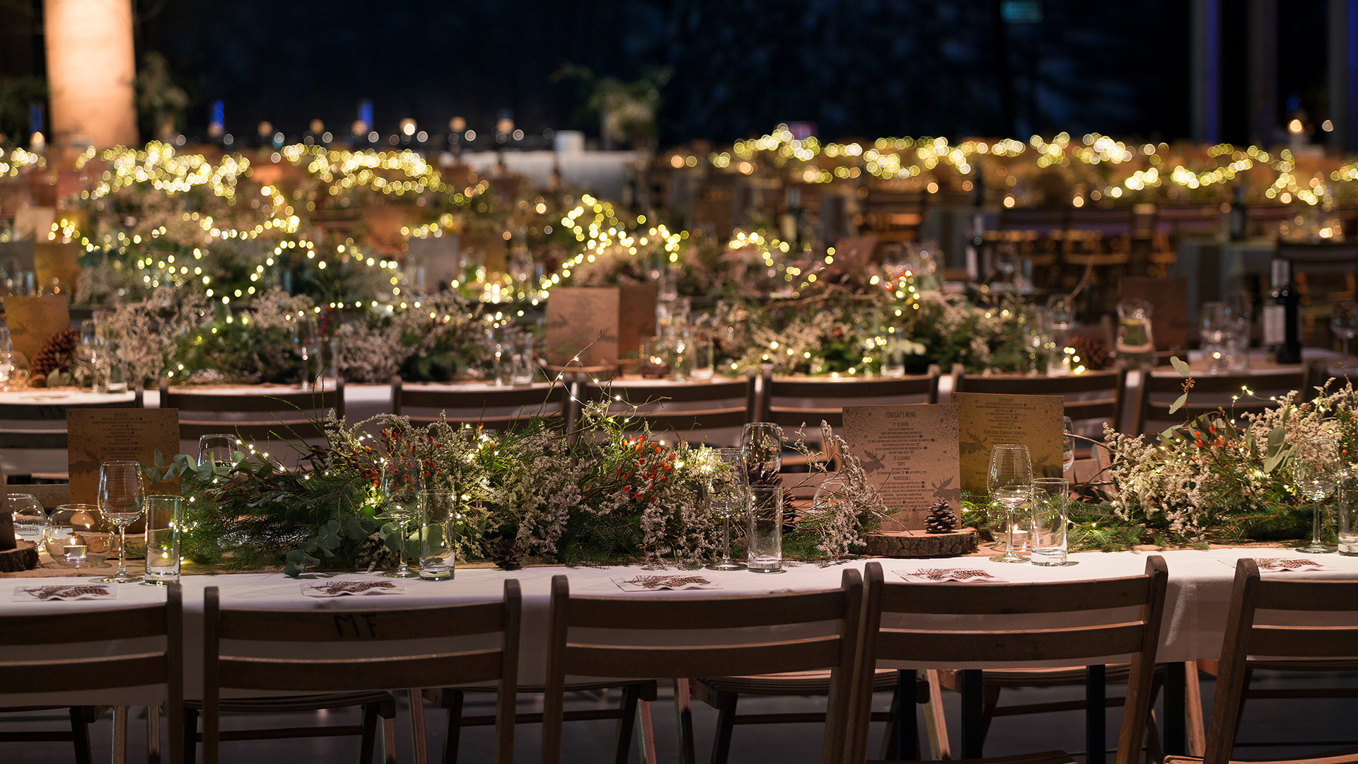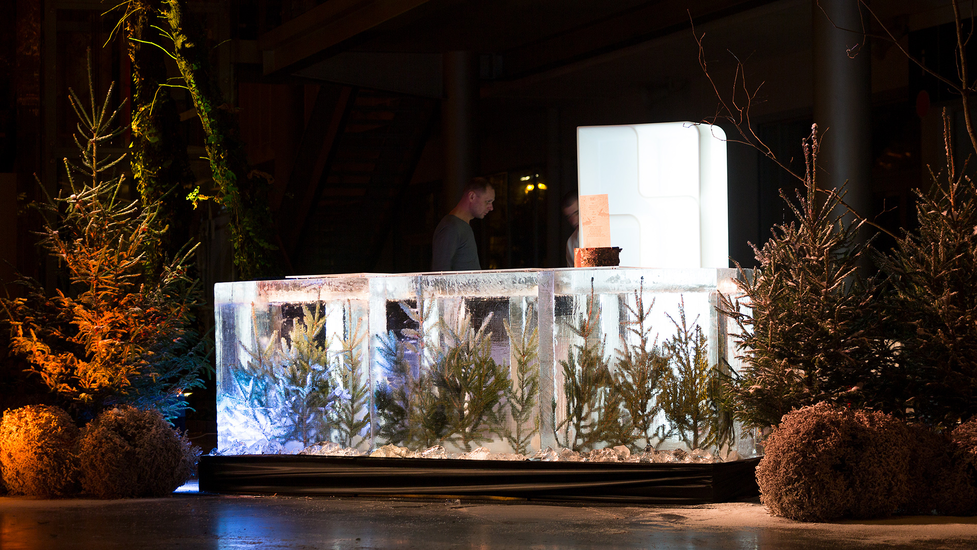 Eventowa przestrzeń zamieniona w skandynawskie miasteczko. Czapy śniegu na dacham i drzewach, przytulne zakątki, wszystko to sprawia, że czujemy się jak przeniesieni do grudniowego Bergen, rozświetlonego pomimo polarnych ciemności. Sanie, renifry, lampiony, w taki świat każdy chętnie się przeniesie, choćby na jedną noc
