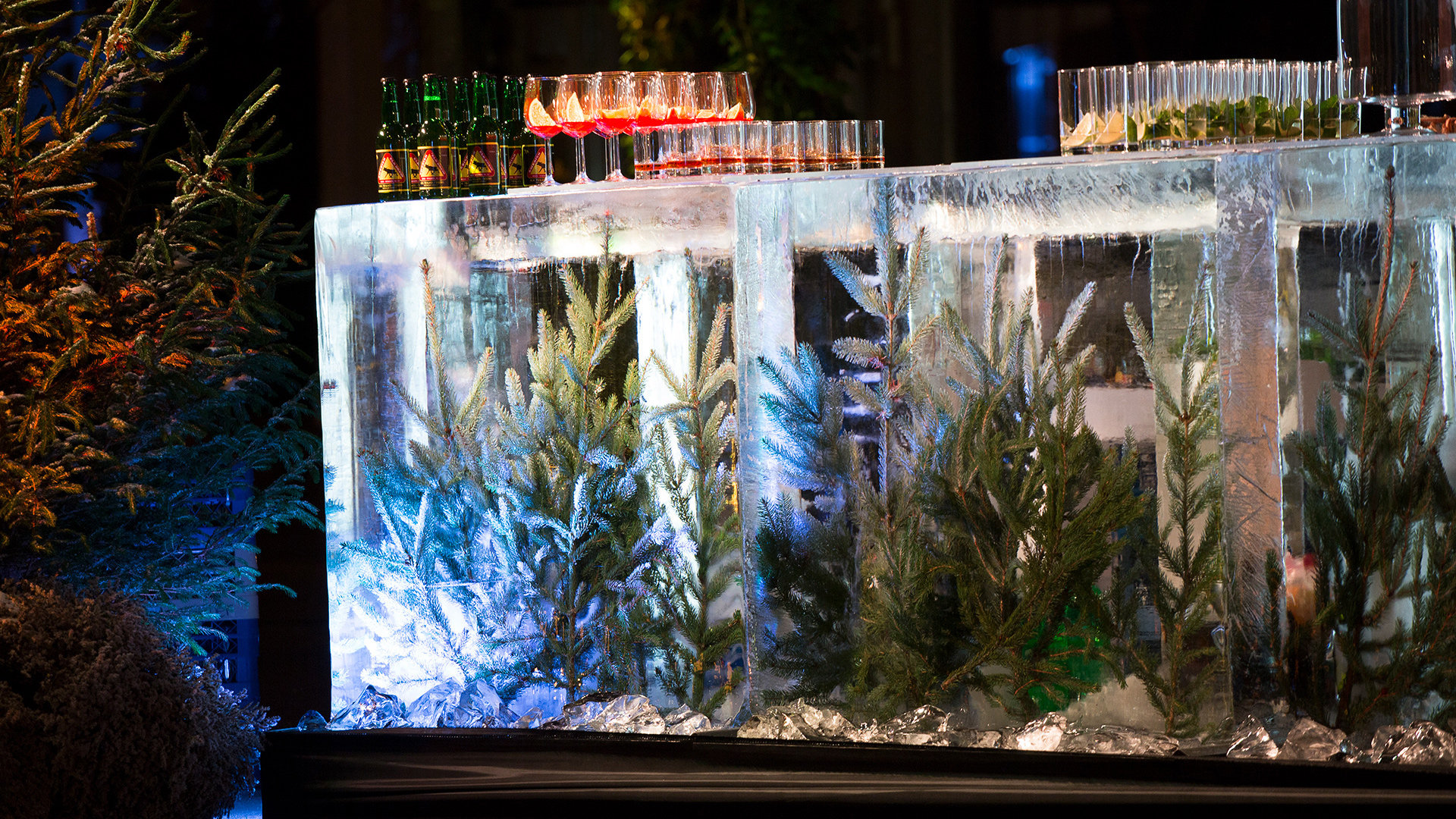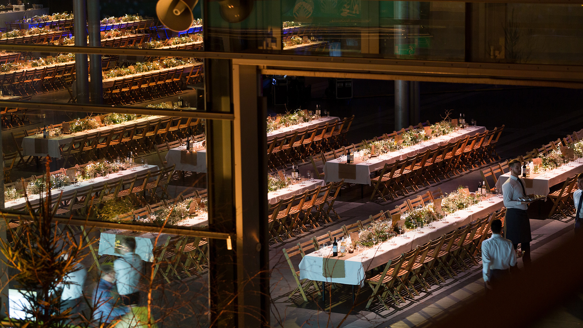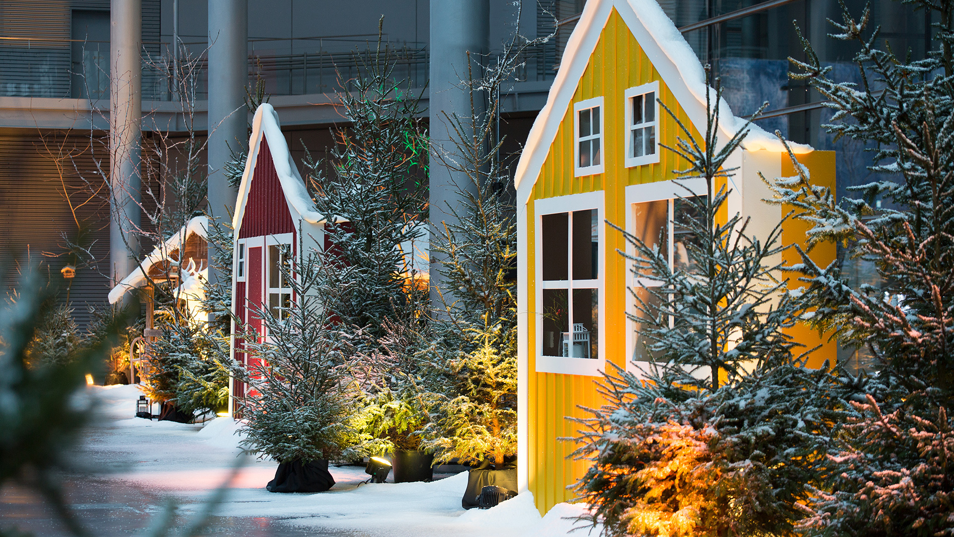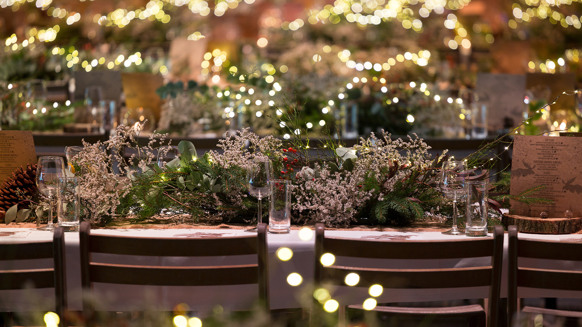 Eventowa przestrzeń zamieniona w skandynawskie miasteczko. Czapy śniegu na dacham i drzewach, przytulne zakątki, wszystko to sprawia, że czujemy się jak przeniesieni do grudniowego Bergen, rozświetlonego pomimo polarnych ciemności. Sanie, renifry, lampiony, w taki świat każdy chętnie się przeniesie, choćby na jedną noc